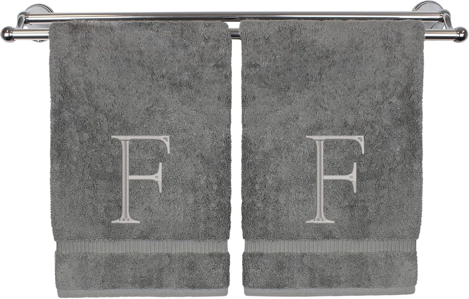 Monogrammed Hand Towel, Personalized Initial Gift, Extra Absorbent 100% Turkish Cotton - Soft Terry Finish - Set of 2 - Silver Block Initial F - Embroidered on Grey Towels