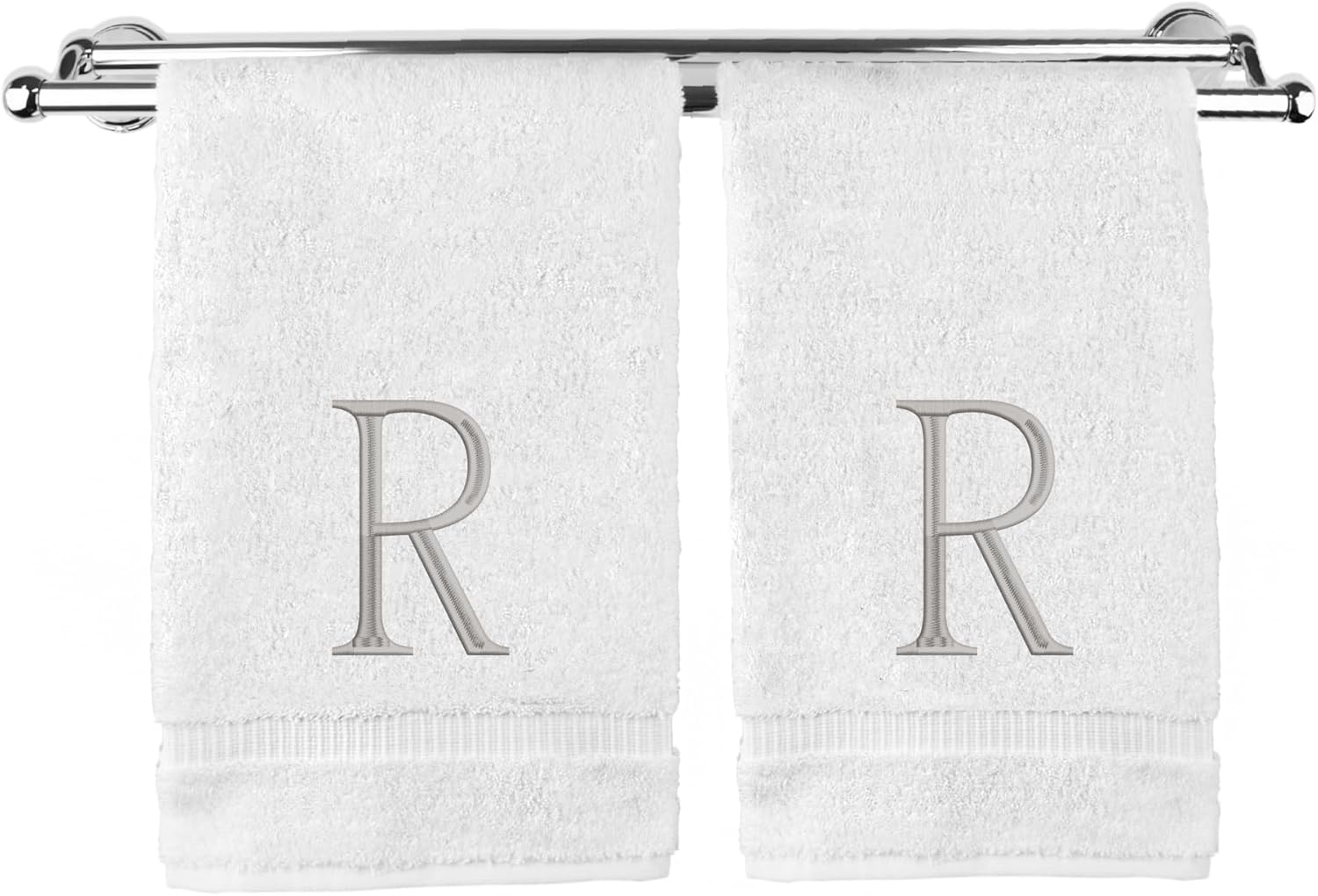 Monogrammed Hand Towel, Personalized Initial Gift, Extra Absorbent 100% Turkish Cotton - Soft Terry Finish - Set of 2 - Silver Block Initial R - Embroidered on White Towels