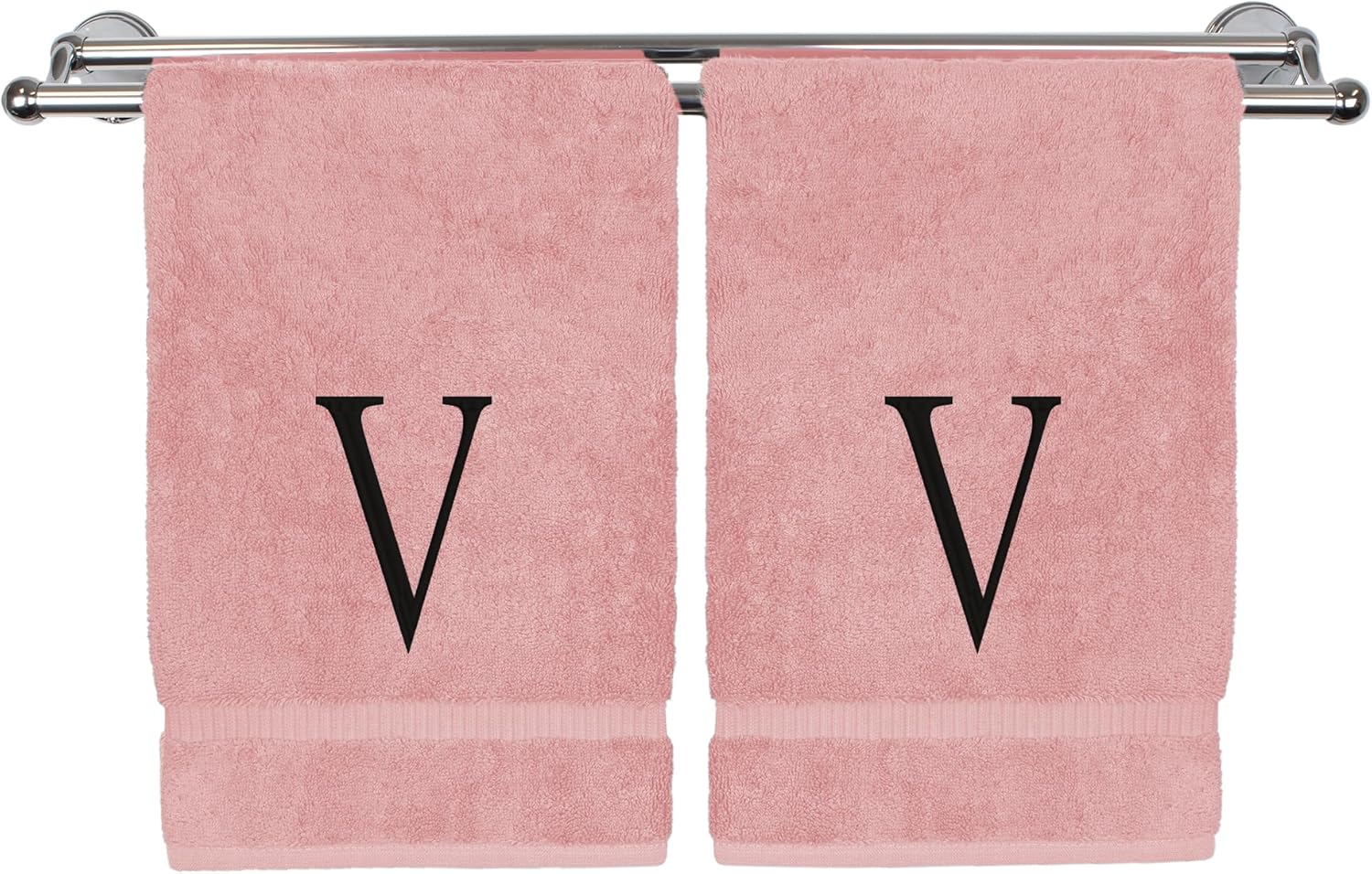Monogrammed Hand Towel, Personalized Initial Gift, Extra Absorbent 100% Turkish Cotton - Soft Terry Finish - Set of 2 - Black Block Initial V - Embroidered on Pink Towels