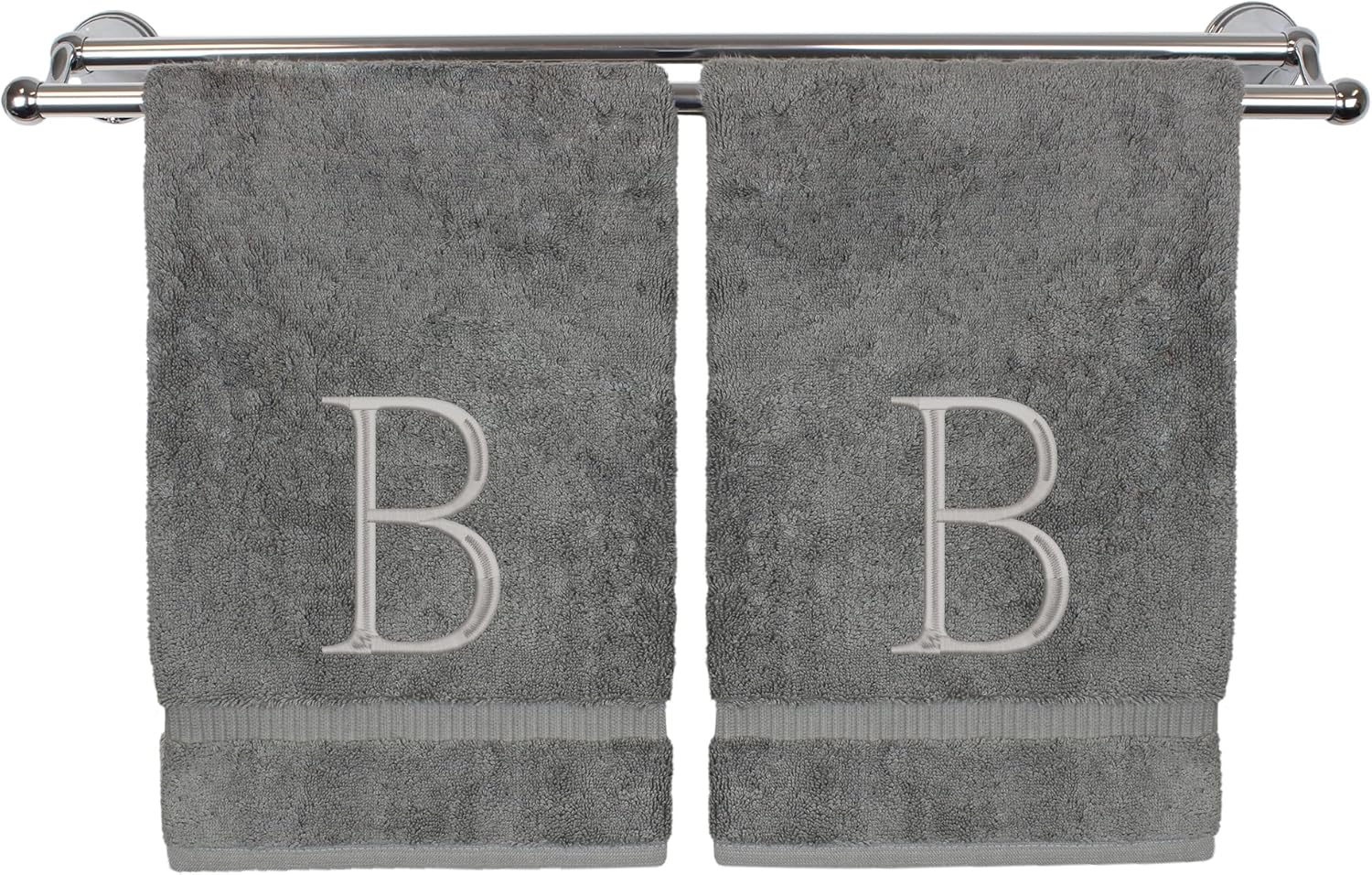 Monogrammed Hand Towel, Personalized Initial Gift, Extra Absorbent 100% Turkish Cotton - Soft Terry Finish - Set of 2 - Silver Block Initial B - Embroidered on Grey Towels