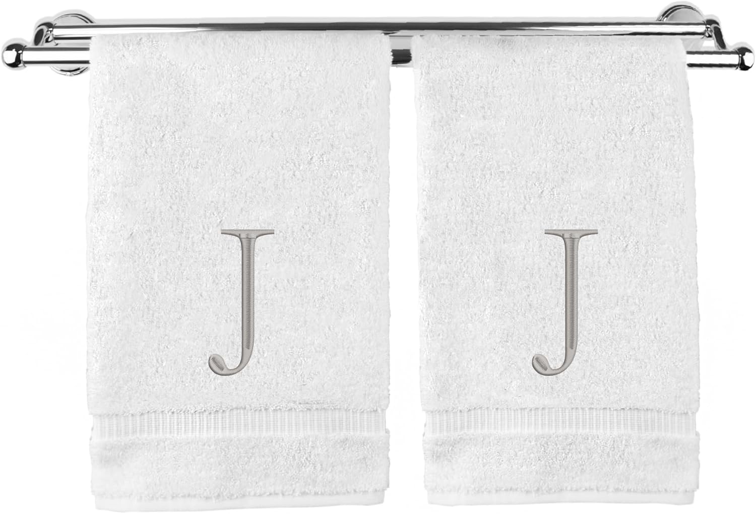 Monogrammed Hand Towel, Personalized Initial Gift, Extra Absorbent 100% Turkish Cotton - Soft Terry Finish - Set of 2 - Silver Block Initial J - Embroidered on White Towels
