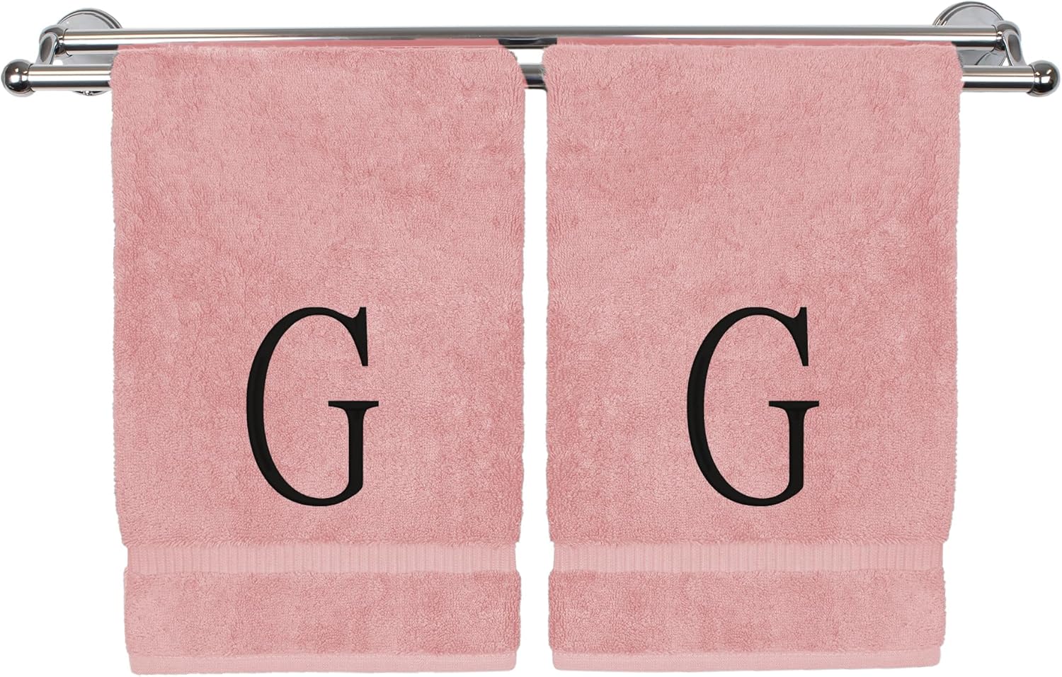 Monogrammed Hand Towel, Personalized Initial Gift, Extra Absorbent 100% Turkish Cotton - Soft Terry Finish - Set of 2 - Black Block Initial G - Embroidered on Pink Towels