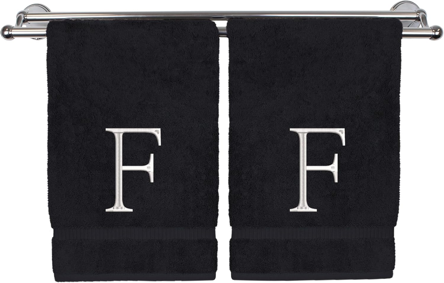 Monogrammed Hand Towel, Personalized Initial Gift, Extra Absorbent 100% Turkish Cotton - Soft Terry Finish - Set of 2 - White Block Initial F - Embroidered on Black Towels