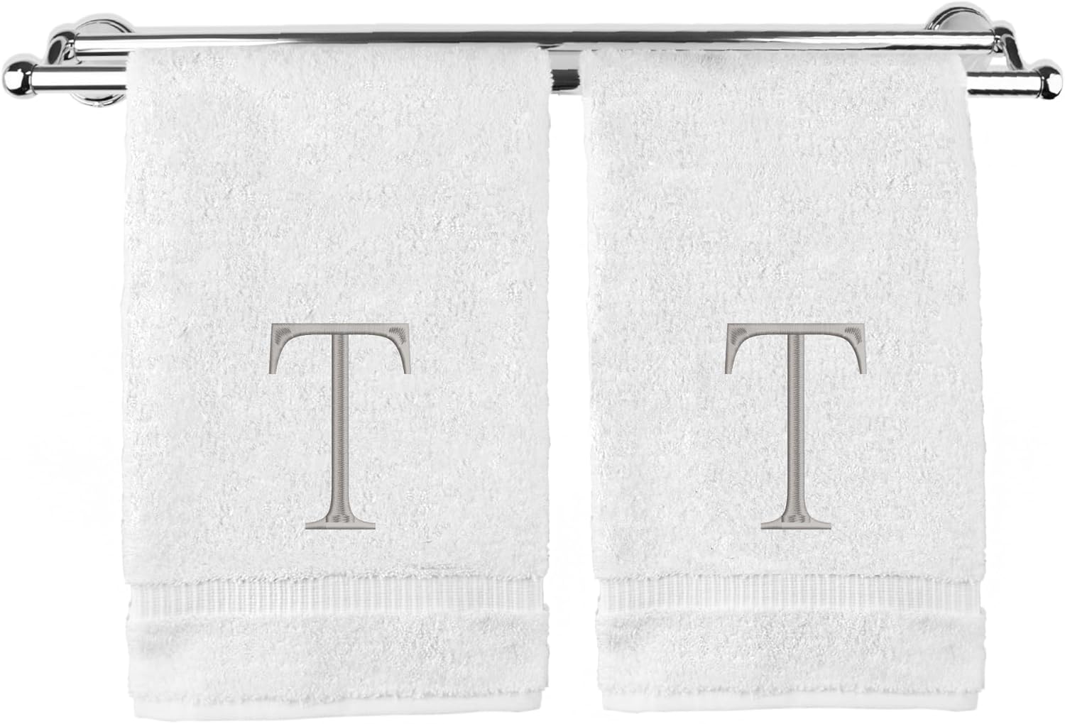 Monogrammed Hand Towel, Personalized Initial Gift, Extra Absorbent 100% Turkish Cotton - Soft Terry Finish - Set of 2 - Silver Block Initial T - Embroidered on White Towels