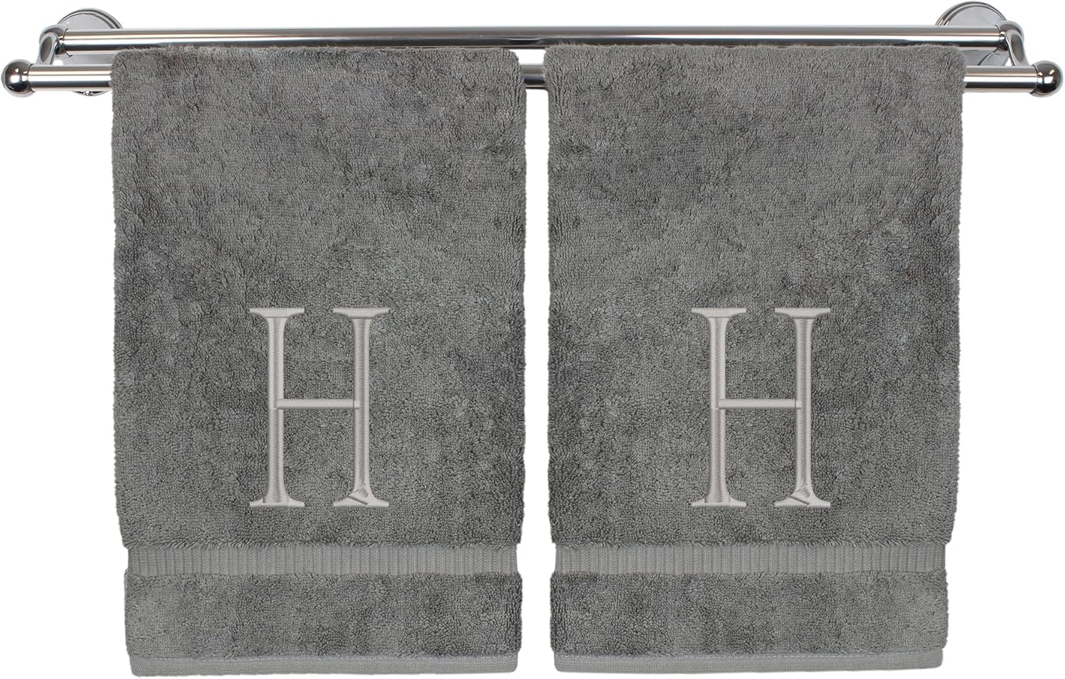 Monogrammed Hand Towel, Personalized Initial Gift, Extra Absorbent 100% Turkish Cotton - Soft Terry Finish - Set of 2 - Silver Block Initial H - Embroidered on Grey Towels