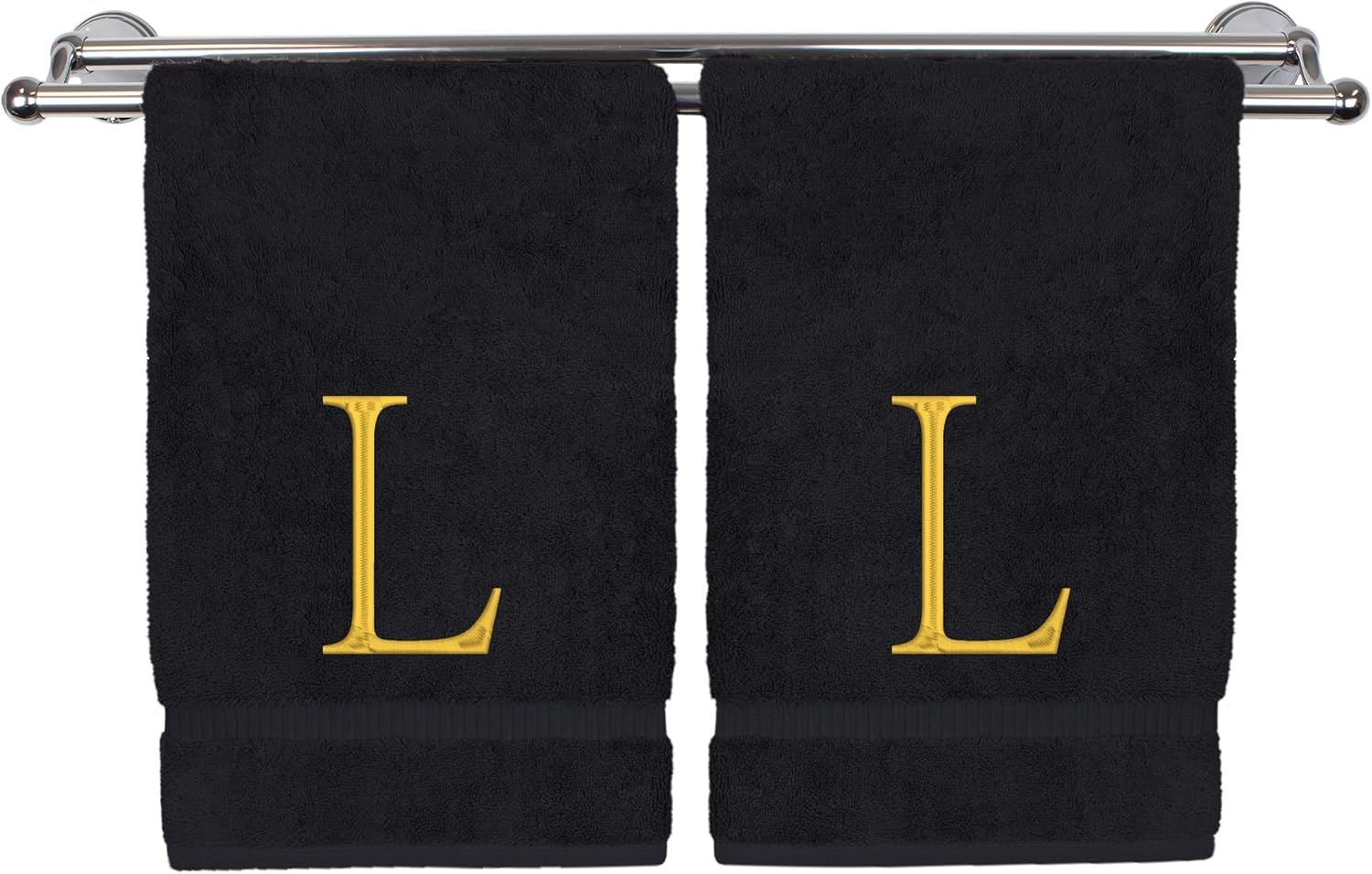 Monogrammed Hand Towel, Personalized Initial Gift, Extra Absorbent 100% Turkish Cotton - Soft Terry Finish - Set of 2 - Gold Block Initial L - Embroidered on Black Towels