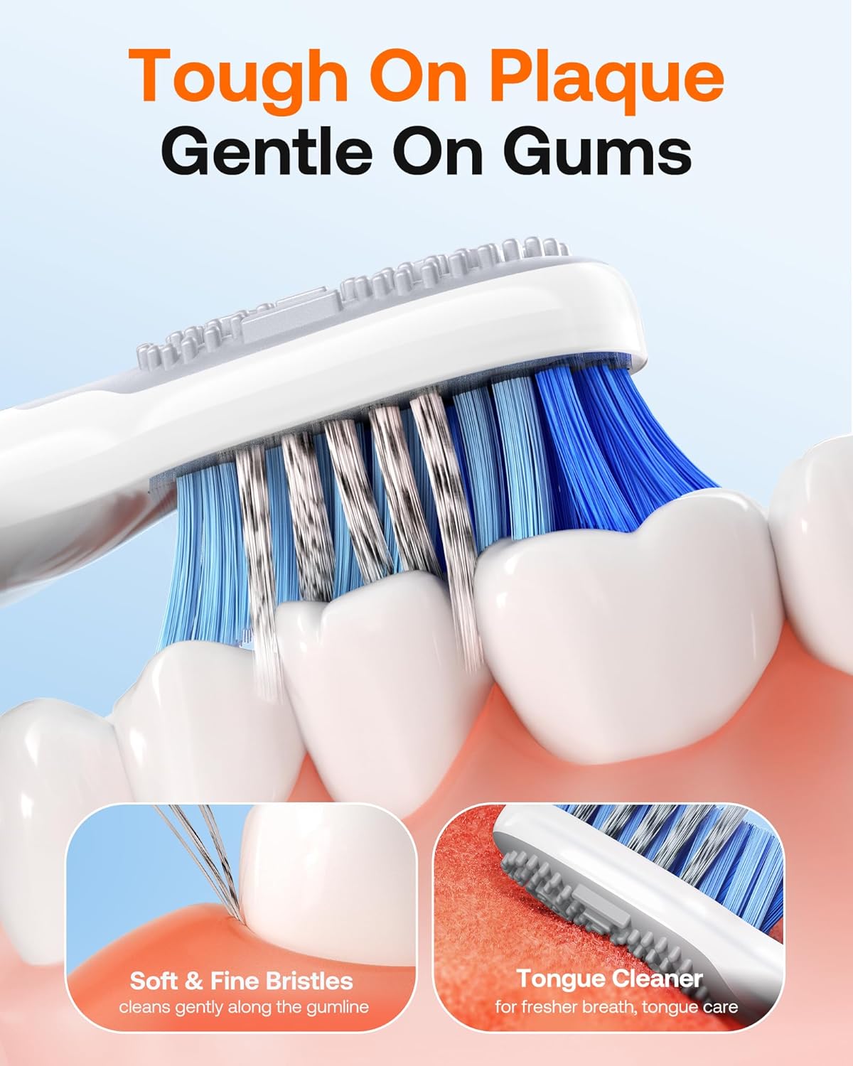 - 8 Replacement Heads for 2 Years of Use: Transform your smile with our cutting-edge toothbrush heads; Featuring precision-crafted firm bristles at the core for deep cleansing action, soft gumcare bristles at the edges to protect your gums