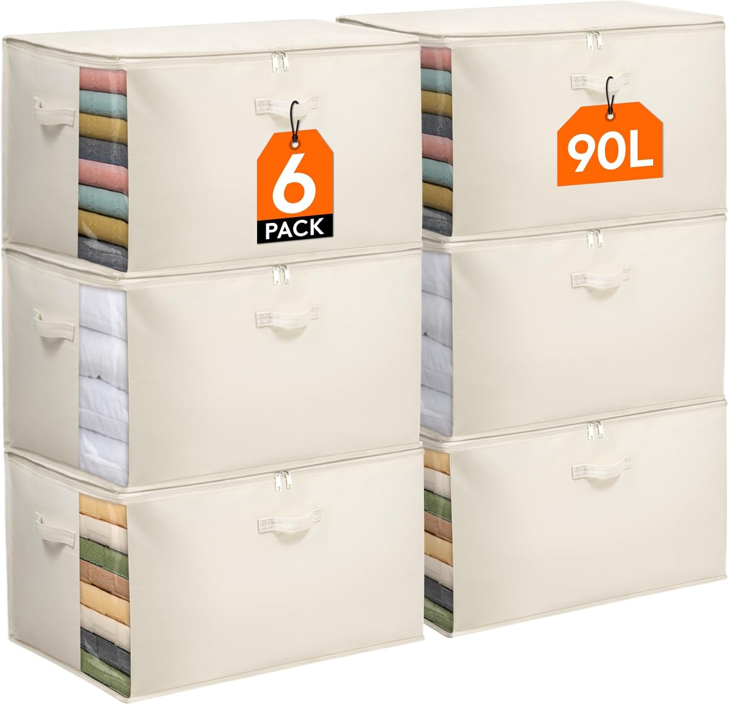 Lifewit Large Canvas Cotton Comforter Storage Bags with Zipper 6 Pack, 90L Breathable Foldable Clothing Containers, Linen Sweater Organizers Boxes for Clothes, Blankets, Pillows, Duvets, Bedding