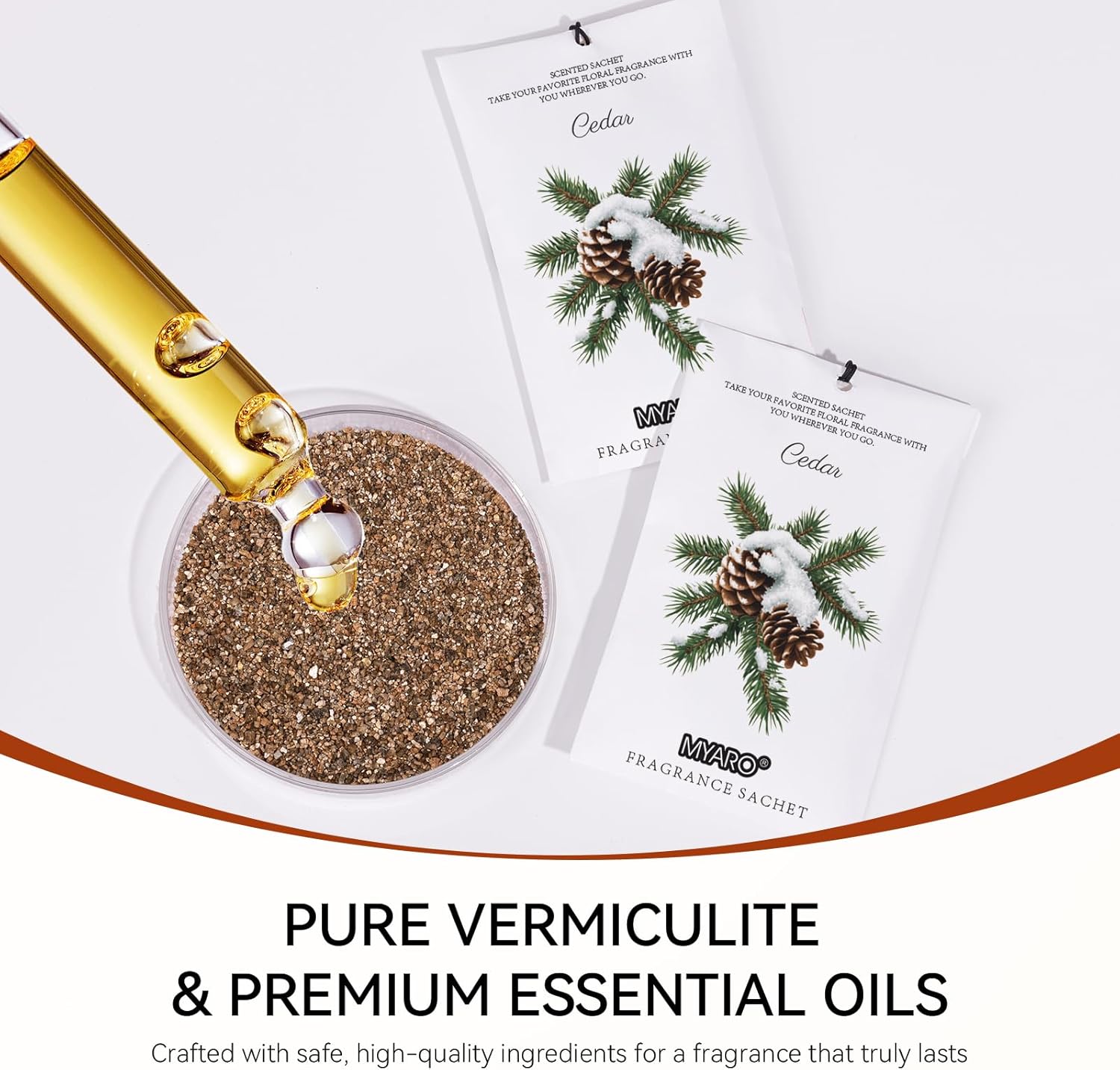 - Refreshing Cedarwood Scent -12 Pack Scented Sachets: Each box includes 12 MYARO cedarwood-scented sachets (4.13" x 2.76"), infused with plant-based essential oils. A clean, woodsy aroma helps refresh your home naturallyâideal for those who love nature-inspired home fragrance