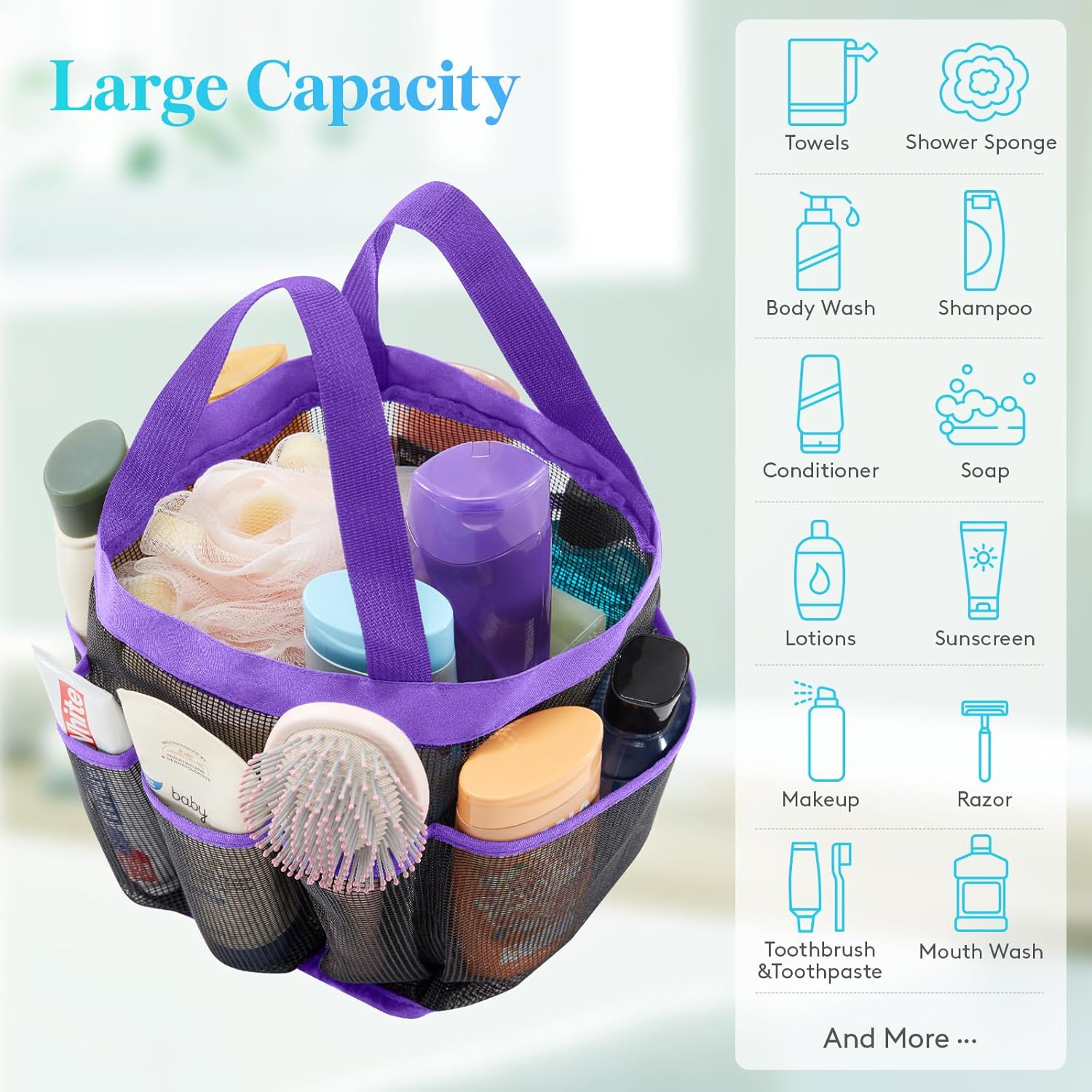 - Plenty of Storage Space: This portable shower caddy with dimensions of 8.7"(22cm) x 8.7"(22cm) x 9.9"(25cm), has 7 side pockets and a large storage compartment in the center to hold all your bathroom accessories or college dorm room essentials: towels, lotions, gels, shampoo, conditioner, soap, body wash, shavers, makeup, sunglasses, razor and more.