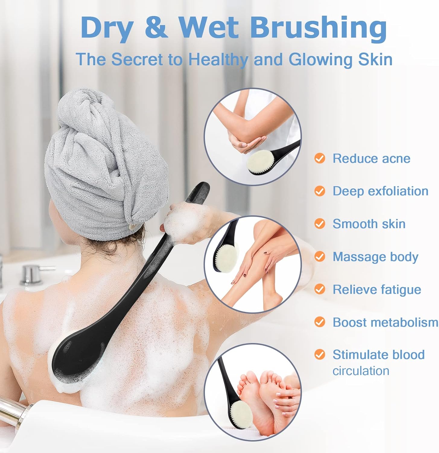 - SMOOTH GLOWING SKIN: Use exfoliating shower brush to remove your dead skin cells, unclog your pores and refresh your skin, so your skin can absorb moisture better and look plumper and less wrinkly, meanwhile, enhance blood circulation and lymphatic flow, and rejuvenate your body.