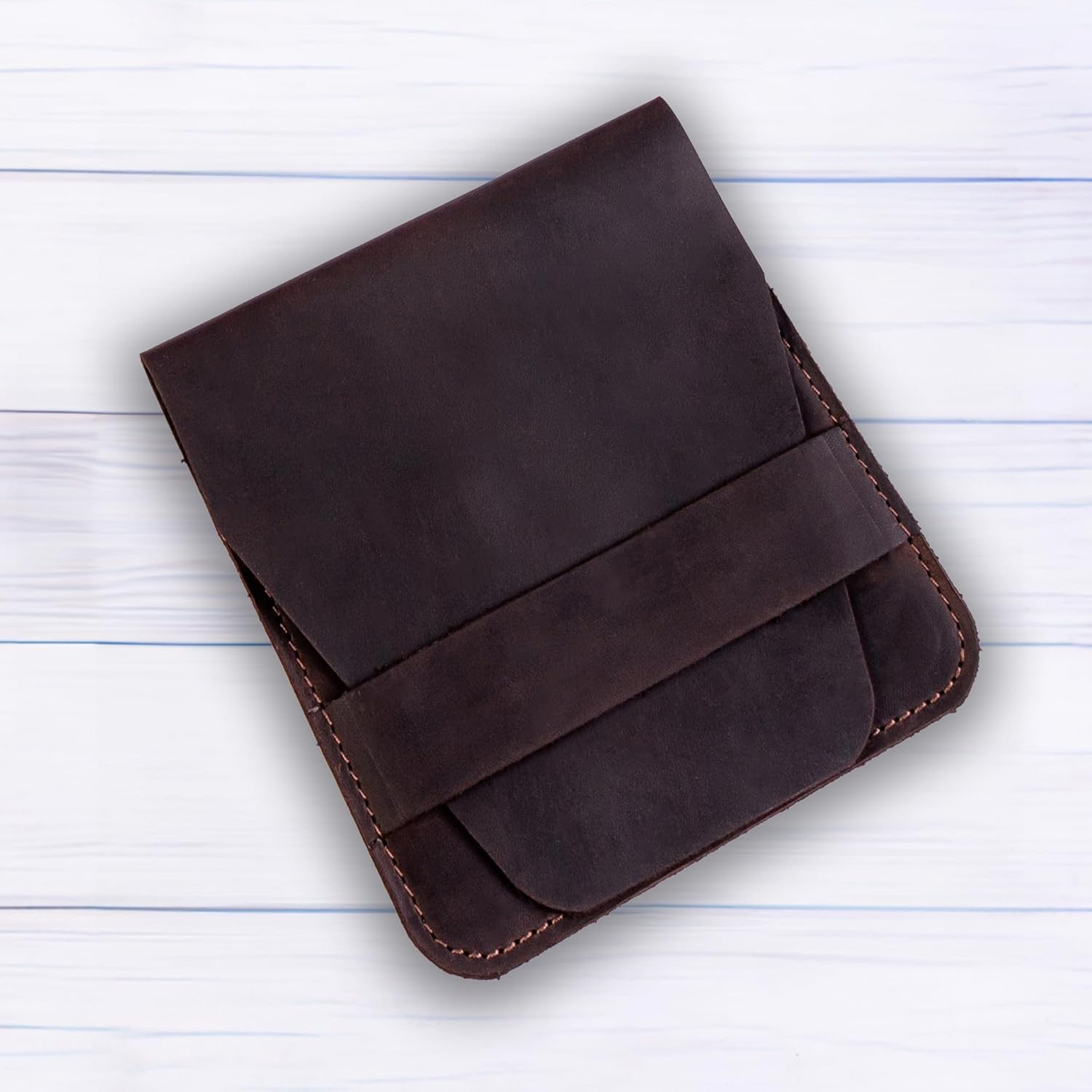 - SIZE - closed case - 5 in * 5.1 in (130mm * 135mm). These holders are hand cut from rustic, durable Genuine Leather and finished with quality fine stitching. Carry your tools with class!