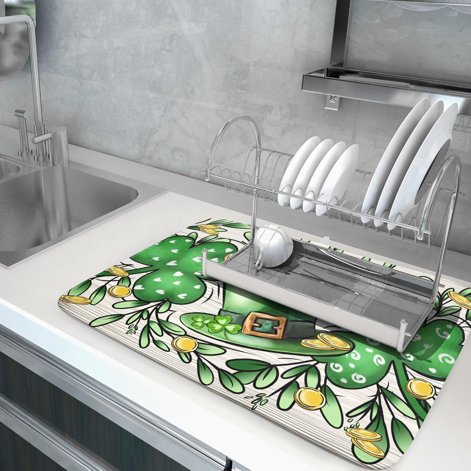 St Patrick's Day Shamrock Dish Drying Mat 18x24 inch Eucalyptus Leaves Dishes Pad Dish Drainer Mats Absorbent Fast Dry Kitchen Accessories