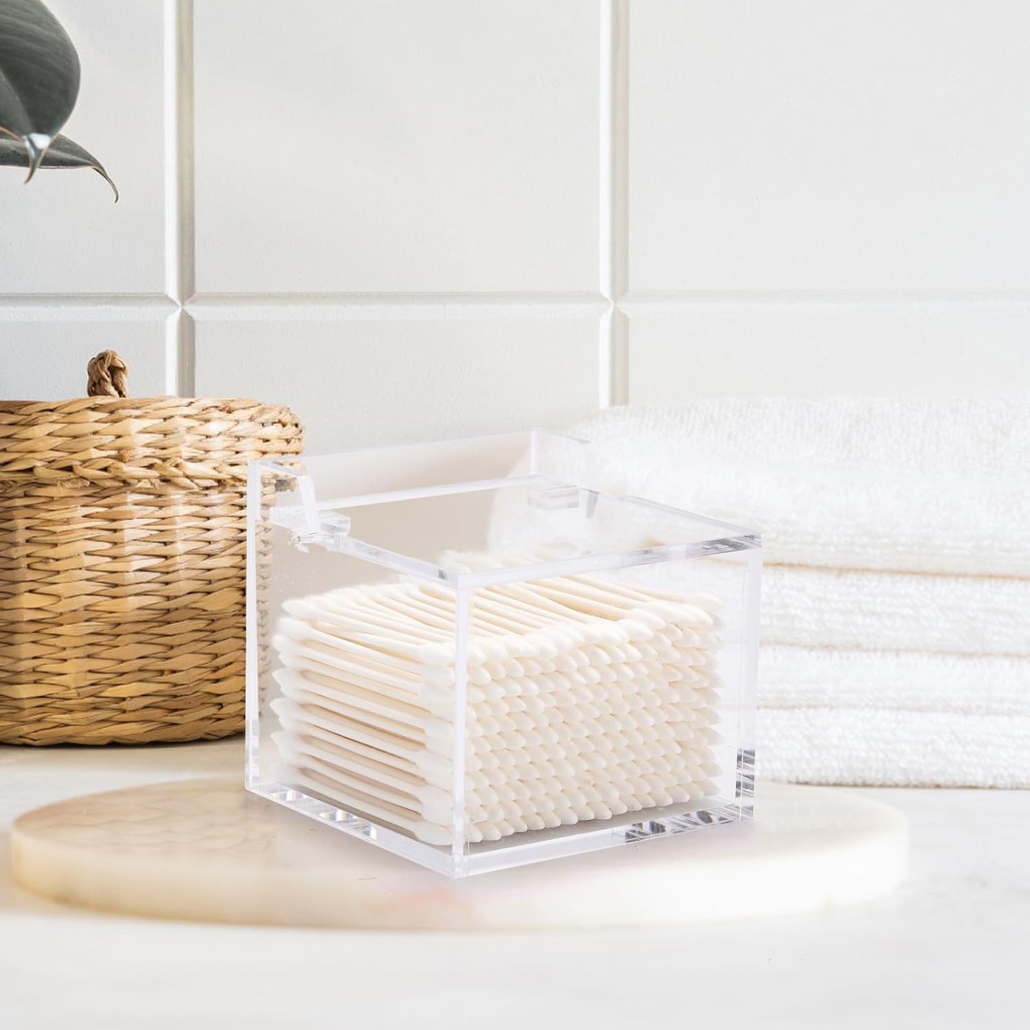 Tbestmax Qtip Holder with Lid, 4mm Thickness Cotton Ball Swab Organizer Acrylic Square Bathroom Containers Makeup Pad Cosmetic Storage - Clear