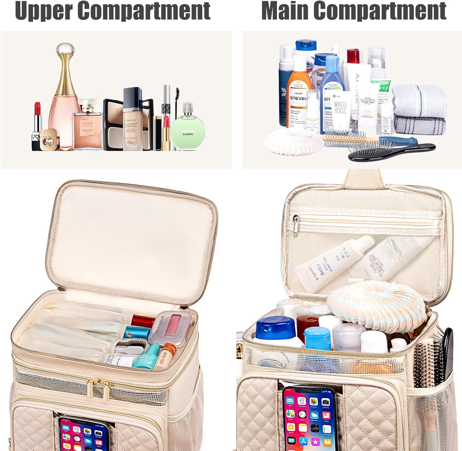 - 【Large Capacity & Versatile Compartment Toiletry Bag】The shower bag total 3 main zippered compartments and 8 pockets,7 flexible holders, ample pockets keep your toiletry items and cosmetics perfectly placed, zipper pocket on the inner top,front and back for convenient to store dry items and small essentials,7 flexible holders in different size to hold bottles,cosmetics and other items that cannot be placed upside down, mesh pockets on both sides for additional storage,The touchable transparent phone waterproof pocket for making and receiving calls,watching videos and listening to music