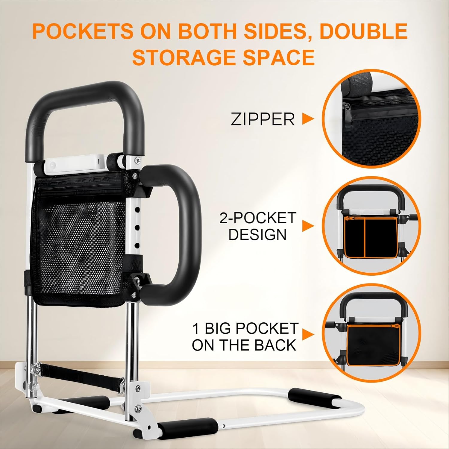 - SENSOR NIGHT LIGHT & ZIPPER STORAGE POCKET: Movable sensor LED night light with magnetic fixing design.And 3 zippered storage pockets on both sides of the bed bars for seniors can safely store your various items.