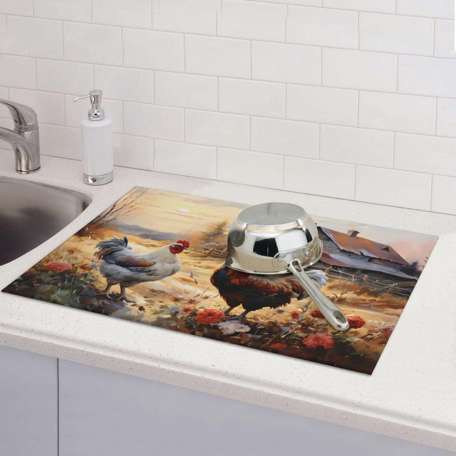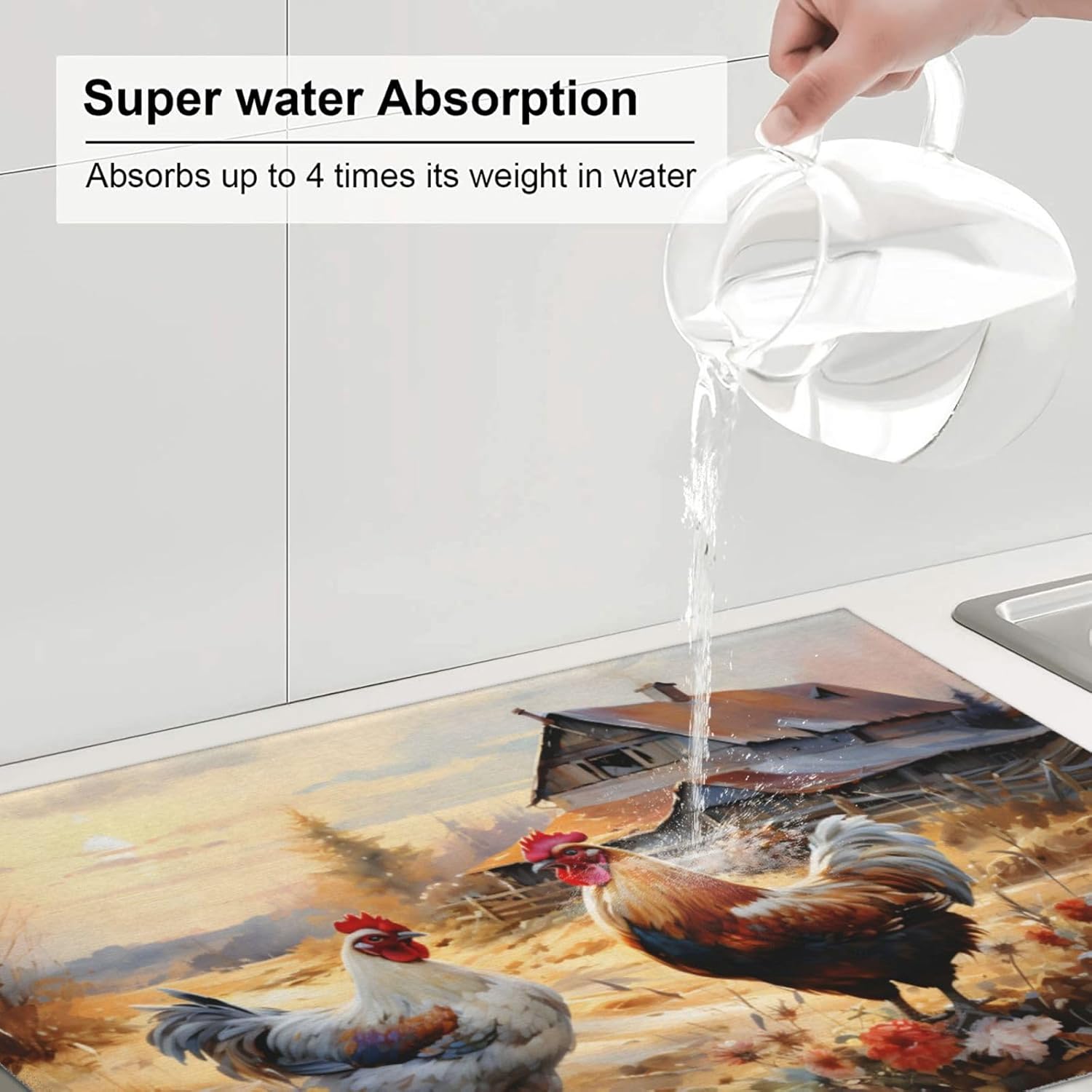 Farm Chicken Dish Drying Mat for Kitchen Counter Absorbent Dish Drying Pad Microfiber Countertop Protector Mat Reusable Dish Drainer Rack Mats Kitchen Accessories 18x24Inch