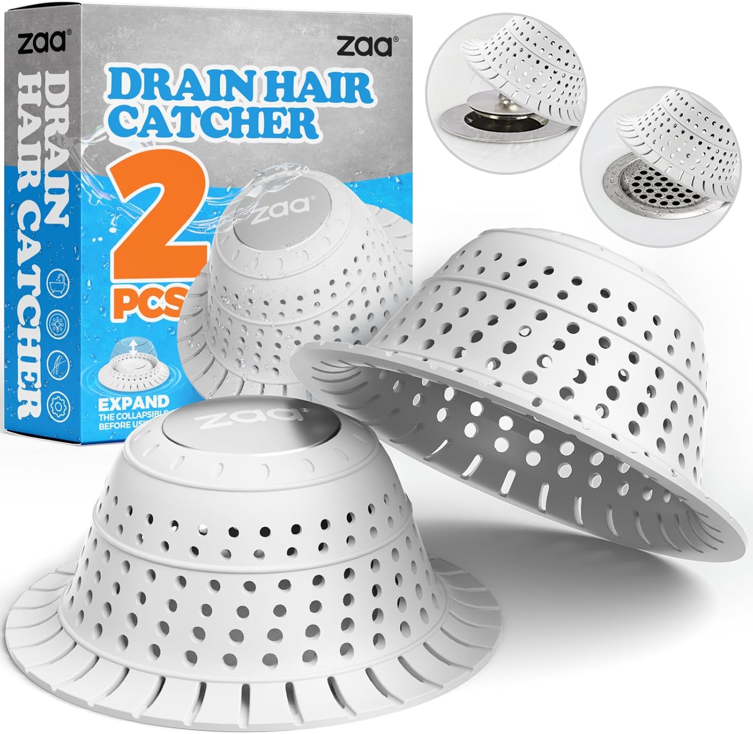 zaa Bathtub Drain Hair Catcher, Premium Silicone Collapsible 2 Pack Drain Protector for Pop-Up and Regular Drains of Shower, Bathtub, Tub, Bathroom, Sink, White