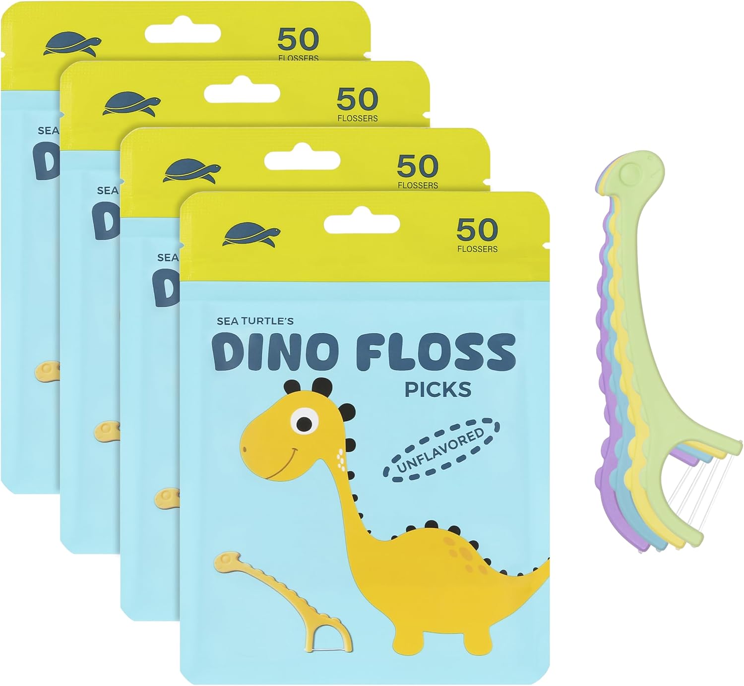 Sea Turtle Kids Dino Floss Picks - Corn Starch Handle - Thin Thread Tooth Dental Flossers - Unflavored (200)