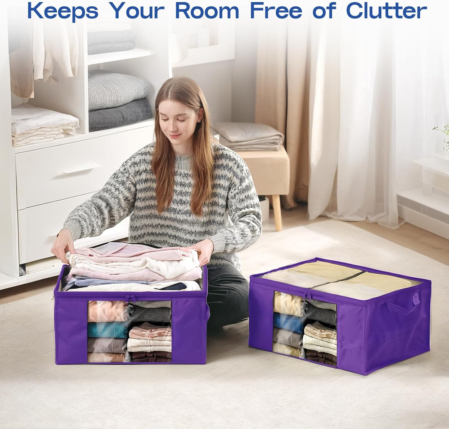Clothes Storage Bags, Foldable Thick Fabric Blanket Storage Bags, Large Clear Window & Carry Handles, Great for Clothes, Blankets, Closets, Pillows, Toys (Purple, 6PACK)