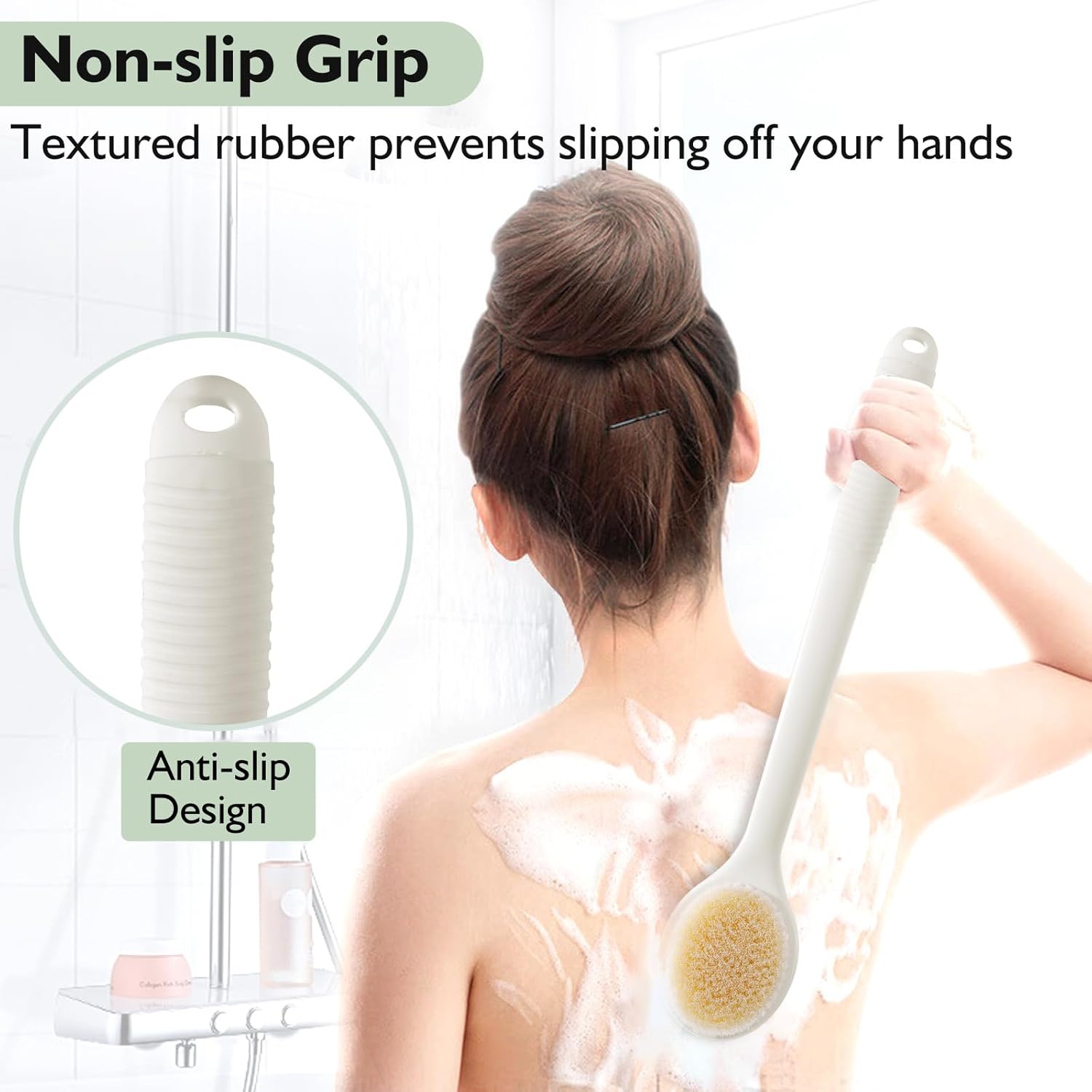 - 17-INCH LONG HANDLE, COVERS MORE: To enhance its functionality as a back brush for the shower, we upgraded the handle to 17 inches, allowing you to reach hard-to-access areas such as your back, lower legs, and feet—no need to bend over anymore. It is especially helpful for those who have difficulty lifting their shoulders or bending at the waist