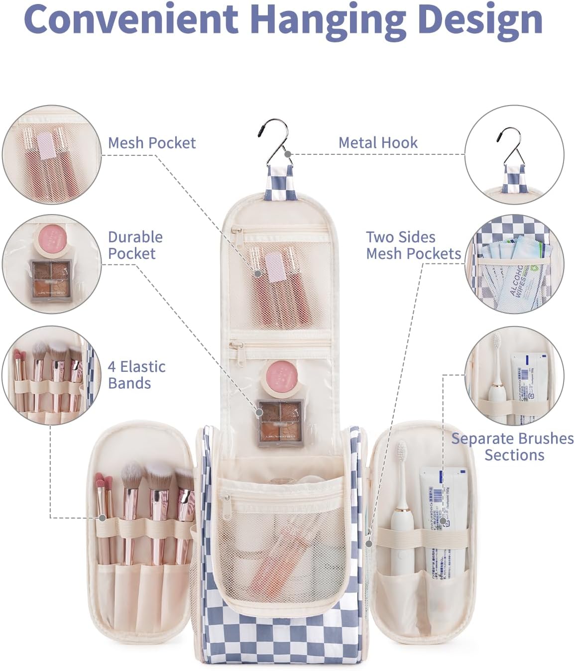 Narwey Small Checkered Hanging Travel Toiletry Bag for Women, Travel Bag for Toiletries, Makeup Bag Organizer Cosmetic Bags Make Up Bags for Women (Grayish Blue Checkerboard)