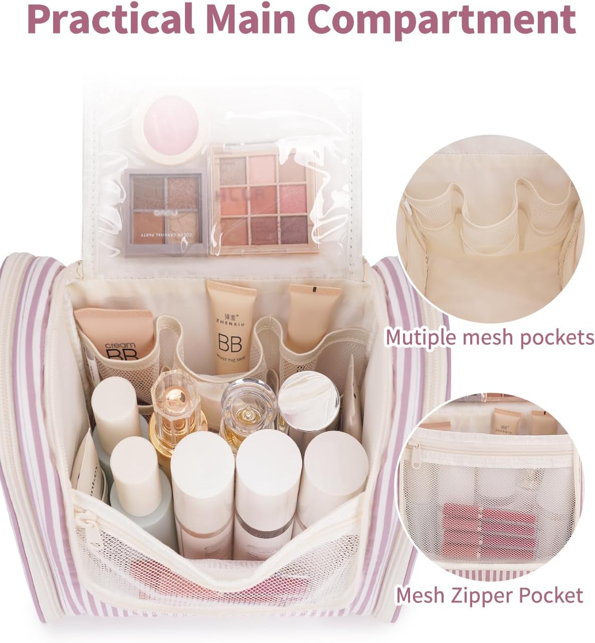Narwey Striped Hanging Travel Toiletry Bag for Women, Travel Bag for Toiletries, Makeup Bag Organizer Cosmetic Bags Make Up Bags for Women (Dusty Rose Stripe)