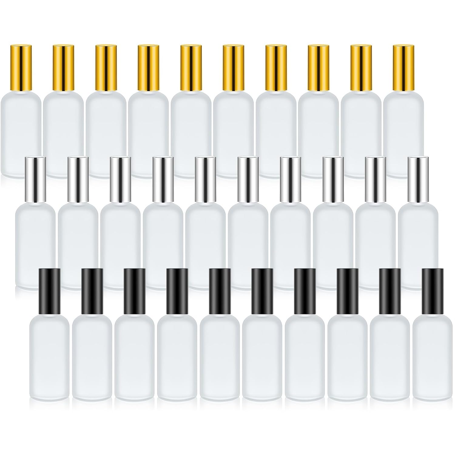 Roshtia 30 Pcs 3.4 oz/ 100 ml Black, Gold, Silver Glass Spray Bottle Refillable Perfume Atomizer Clear Decorative Empty Bottles with Fine Mist Sprayer Pump for Face Body Travel