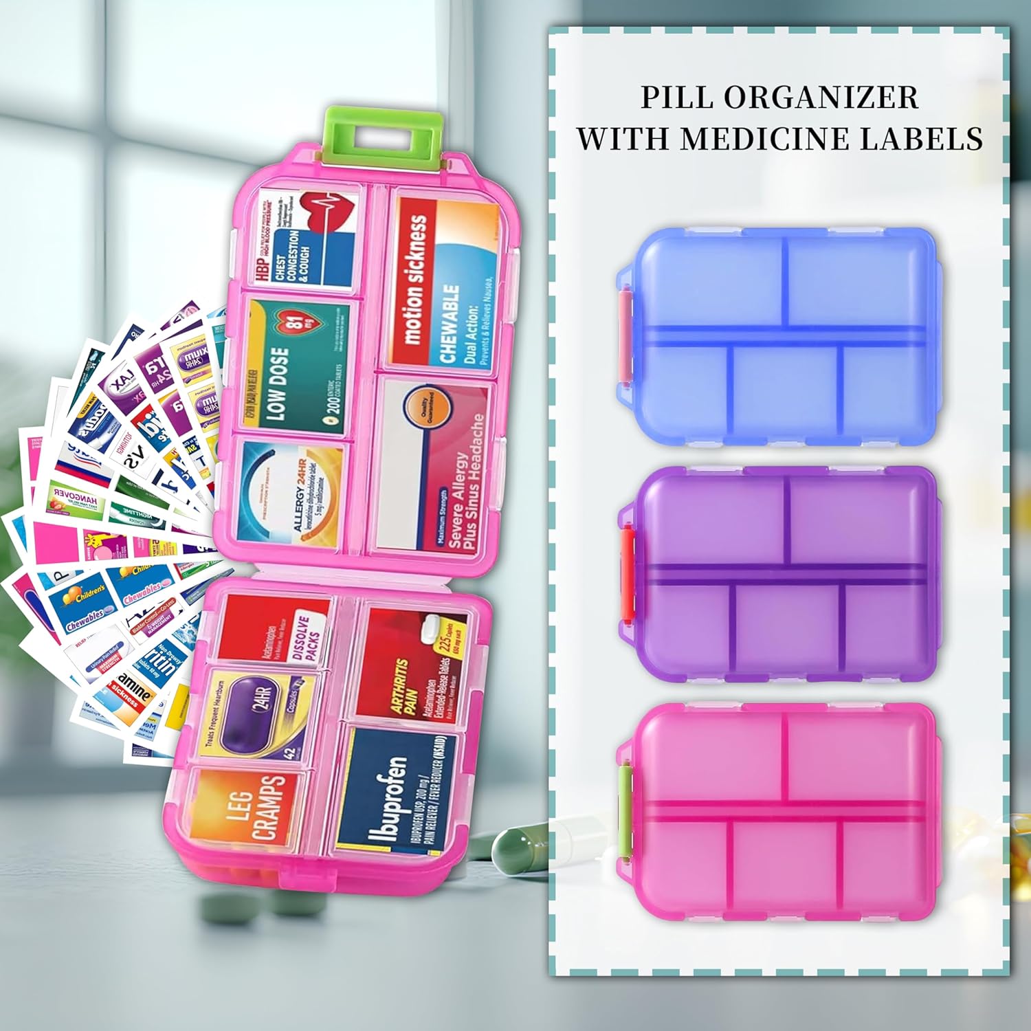 Pill Organizer with Medicine Labels, Travel Daily Pill Container, Mini Medication Organizer, 7-Day Pill Case, Set of 3 (Blue+Pink+Purple)