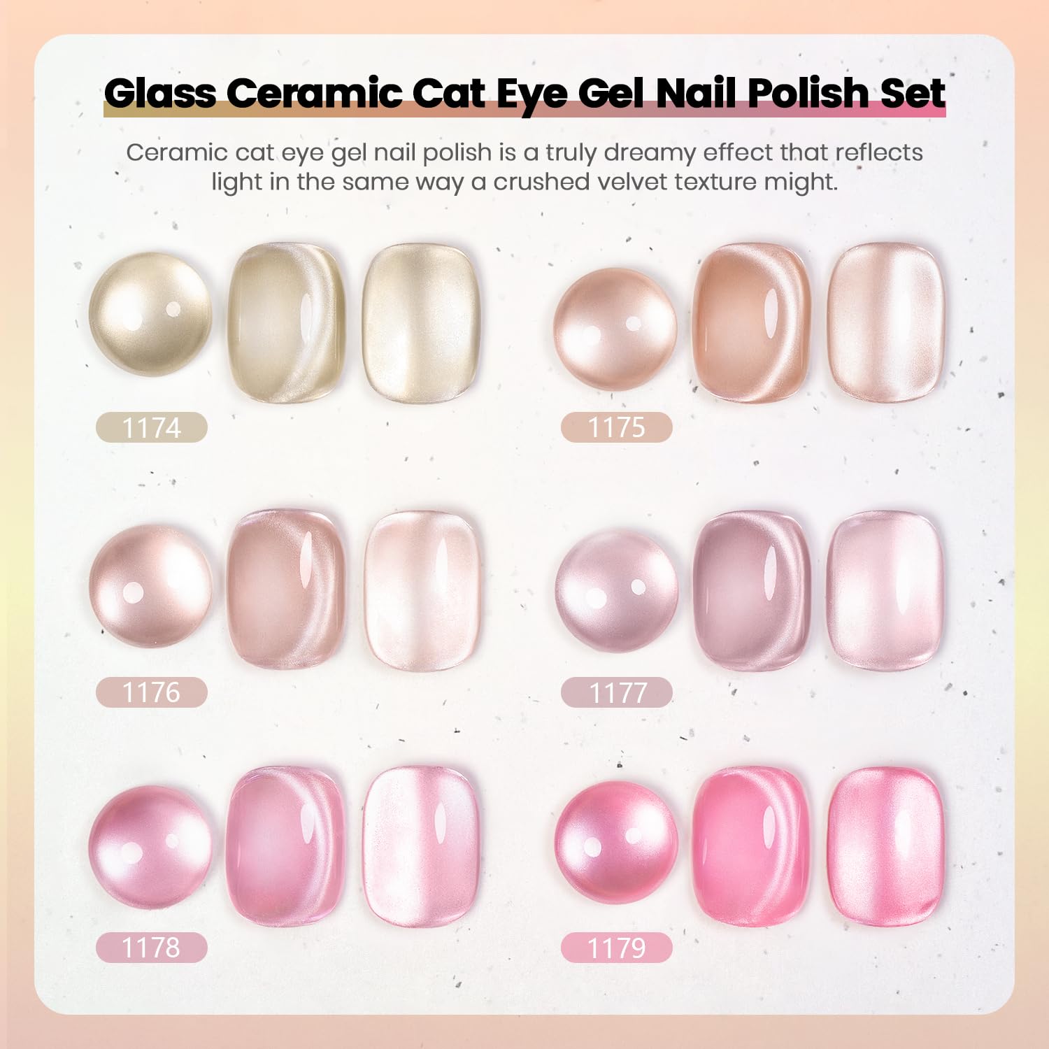 - CERAMICS CAT EYE EFFECT:These six smooth ceramics glitter cat eye gel nail polish colors feature a nude skin tone, soft glow with a gradient transition from warm gold to delicate pink.Made with magnetic shimmers and silver pigments, our new shades create optical nail-lusions that move with every angle