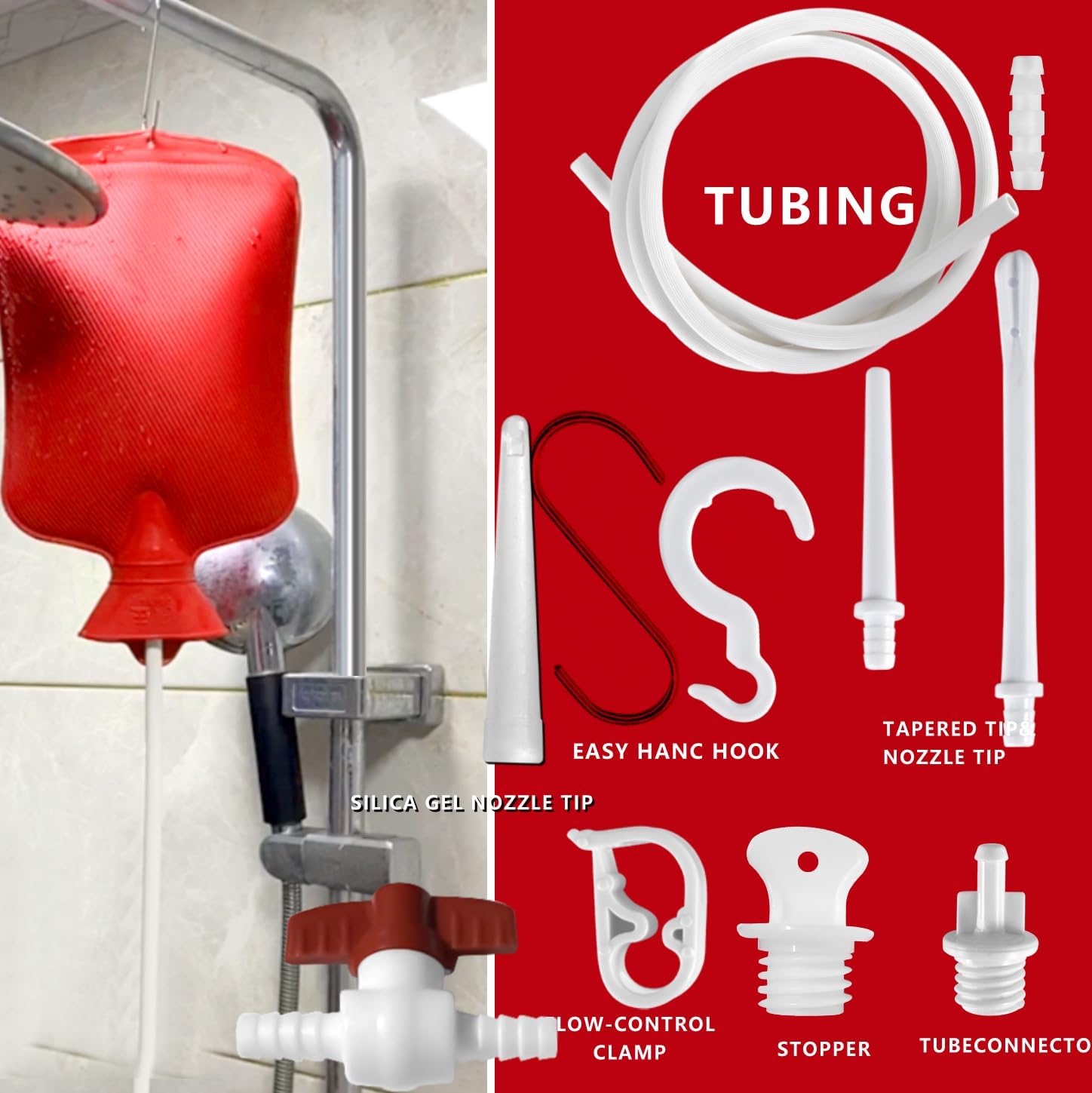 2 L Home Enema Bag Kit with 2 Enema Tips,60 inch Long Silicone Hose, Controlable Water Flow Valve, Hot-Water Bottle for Colon Cleansing Enemas (Upgraded-red)