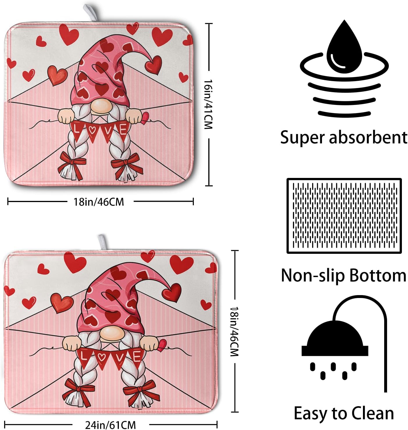 - Easy Storage & Care: Machine washable or hand washable. Machine wash with cold water in gentle cycle. Do not bleach, tumble dry low. The Valentines Day Dish Drying Mat for Kitchen Counter is designed to be durable and long-lasting. Includes a sewn in hang tab to hang up mat to dry fast