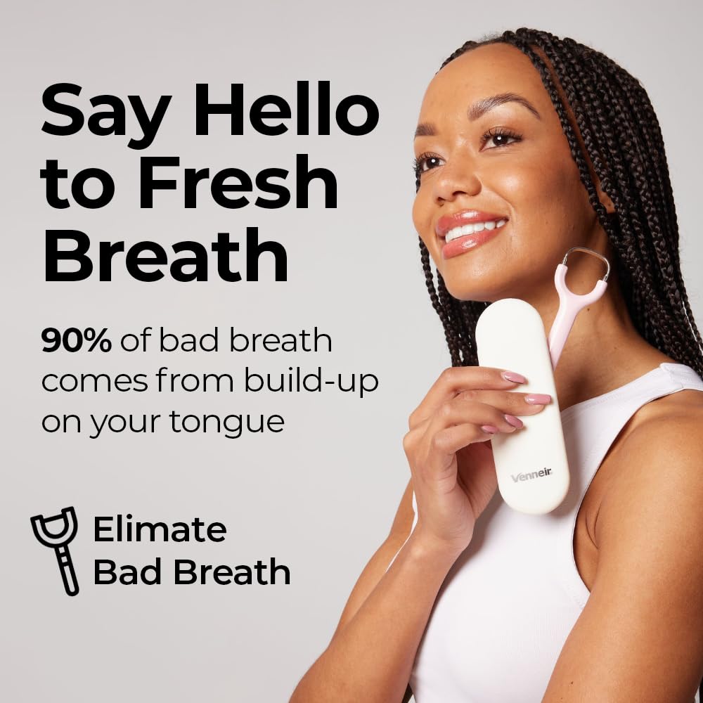 Venneir® Tongue Scraper with Travel Case, Oral Glide Pro–Bad Breath Treatment, Medical-Grade Stainless Steel– for Adults & Kids. 100% Rustproof, Sleek & Effective Design (Pink Frost)