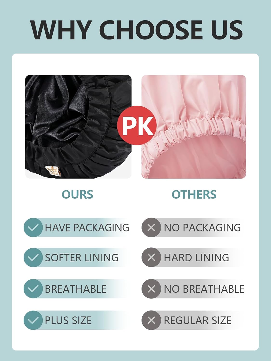 - Waterproof Hair Protection: Made with a dual-layer design, featuring waterproof memory cotton and a soft satin lining, our shower cap prevents water from soaking through and helps protect your hair from damage. Ideal for all hair types, including long hair