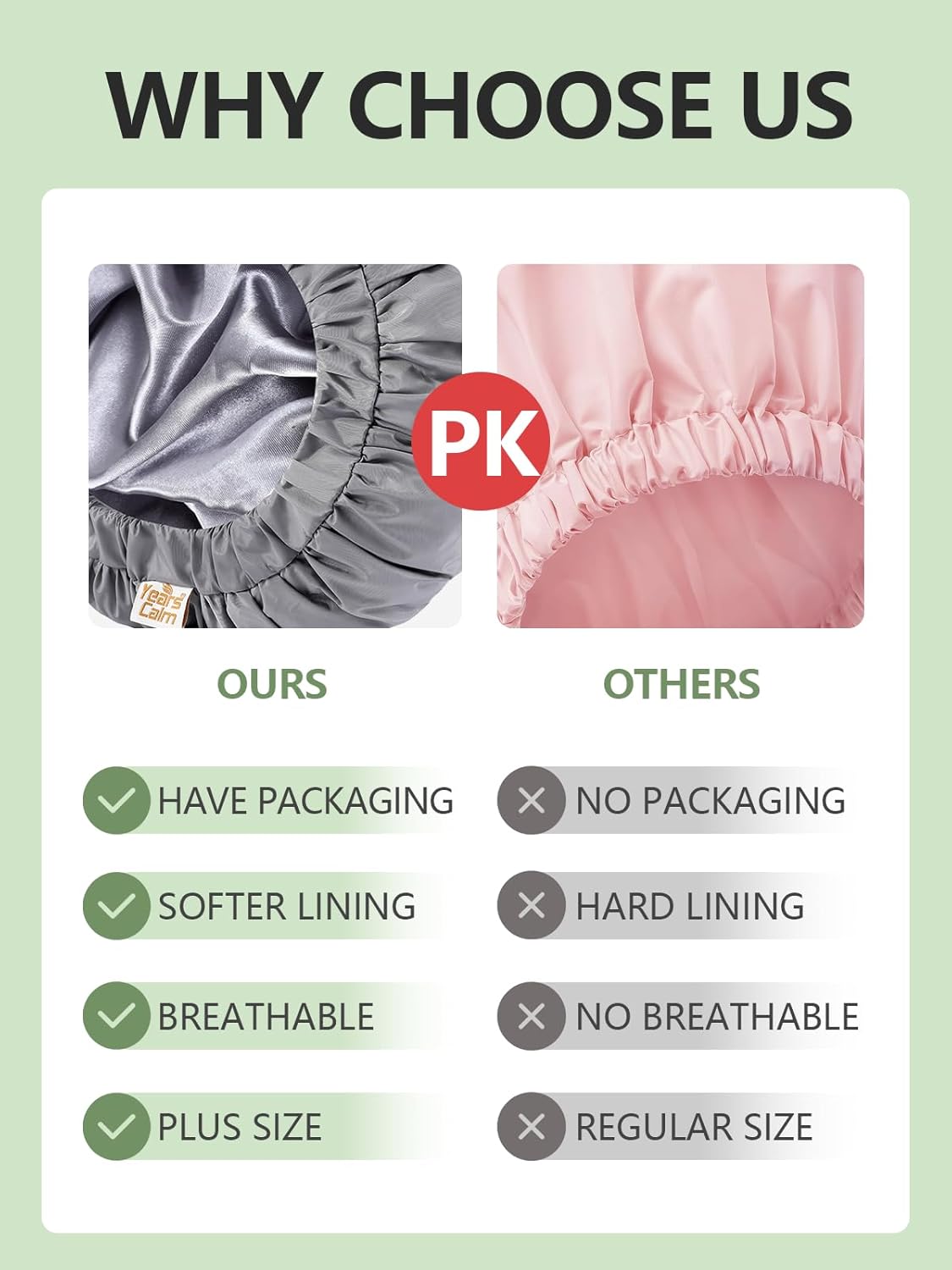 - Waterproof Hair Protection: Made with a dual-layer design, featuring waterproof memory cotton and a soft satin lining, our shower cap prevents water from soaking through and helps protect your hair from damage. Ideal for all hair types, including long hair