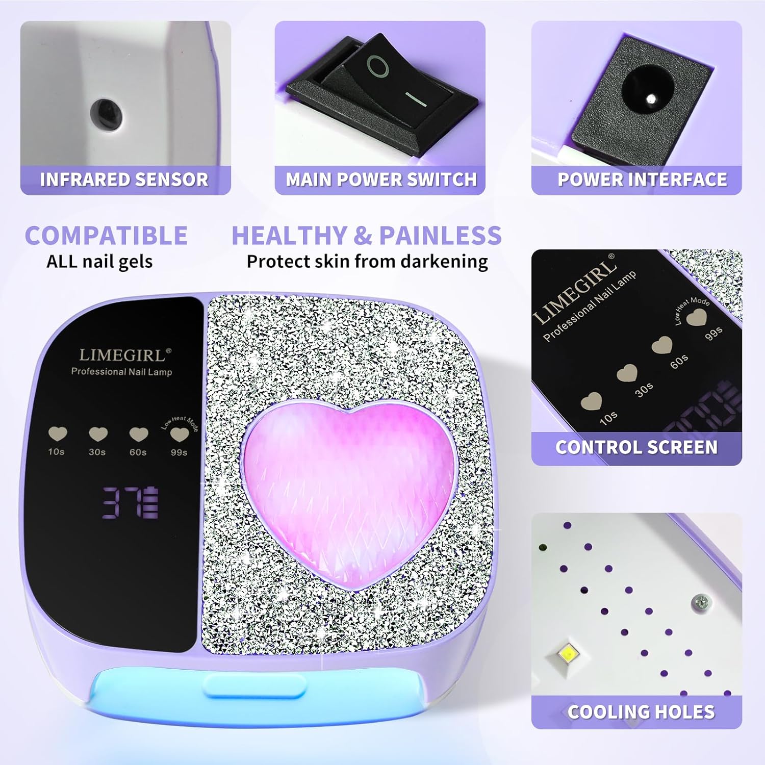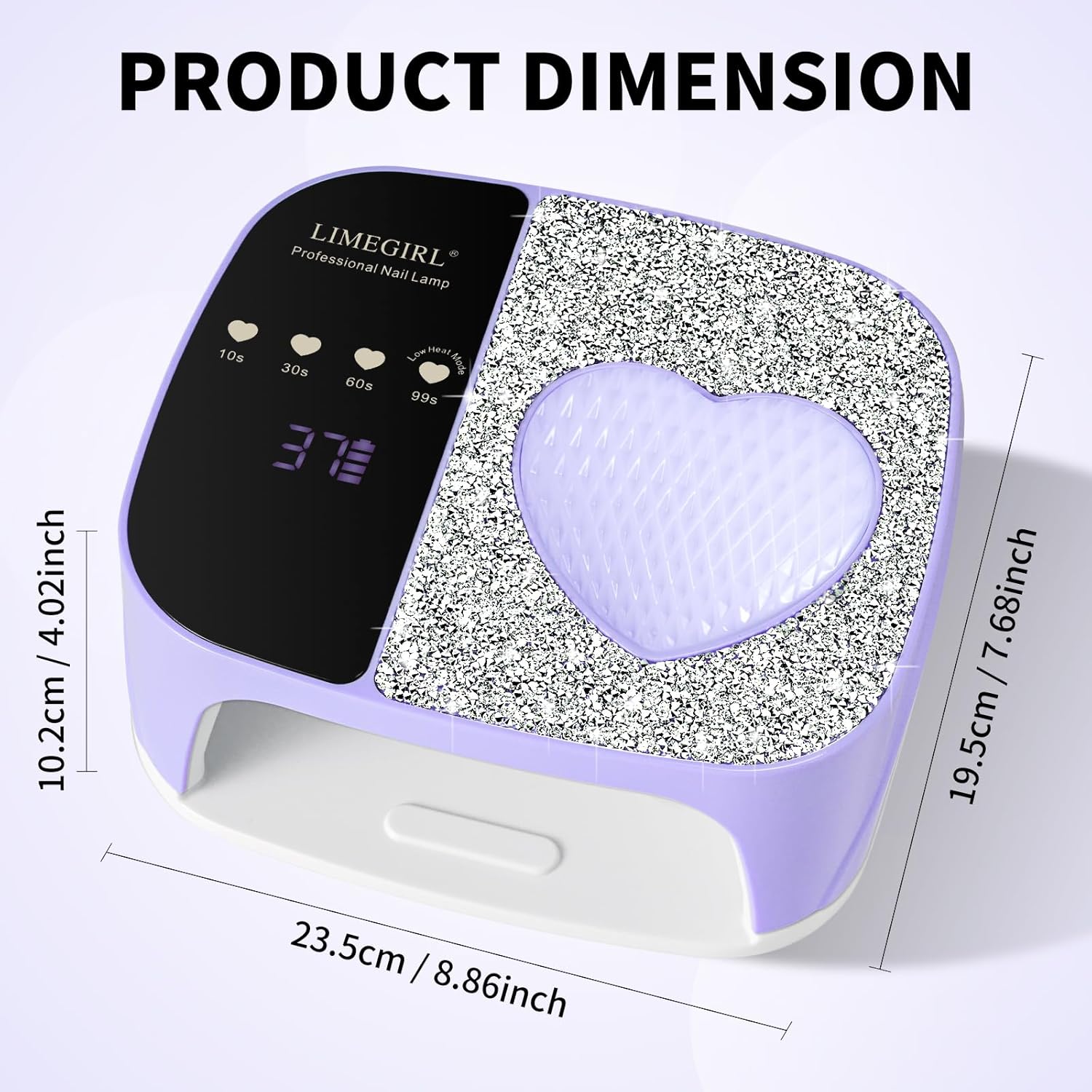 - Rhinestone and Heart Ambient Light: LimeGirl rhinestone gel nail UV light lamp comes with delicate design,and the heart light provide a sense of atmosphere as well as a reminder of the power situation,the gel nail uv light lamp features a rhinestone cover and durable materials,presenting a sparkling diamond effect,which look more attractive and use comfortably.