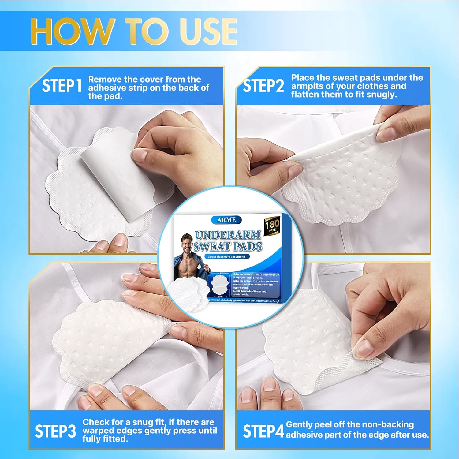 Arme Armpit Sweat Pads, 180 Pcs Wider and larger Underarm Sweat Pads for Men Hyperhidrosis, Disposable Sweat Pads for Under Arms, Sweat Free Armpit Protection for Outdoor Work Meeting
