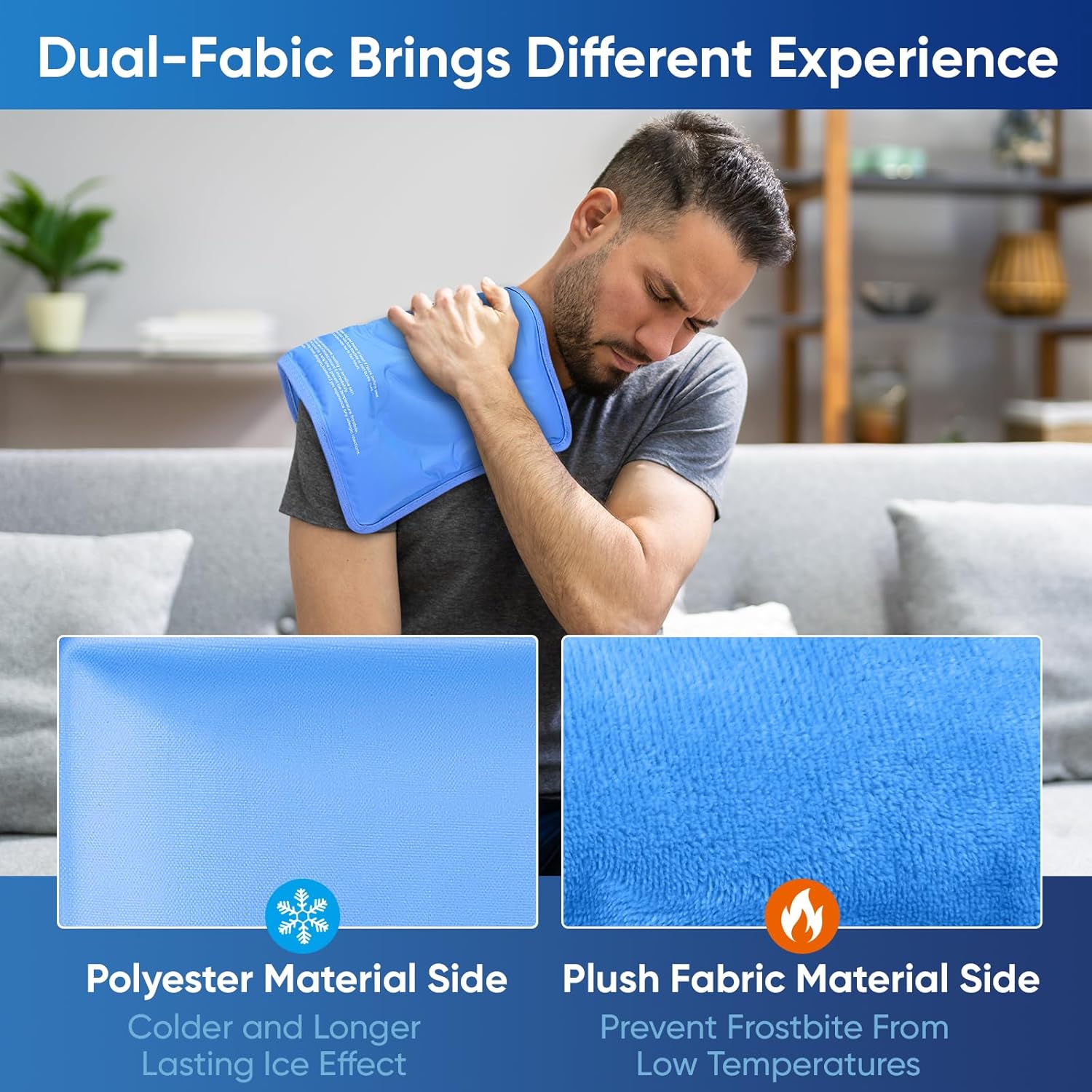 - Double-Sided Material: The gel ice packs reusable feature two-sided materials, one side is made of polyester for a stronger and longer-lasting cooling effect, while the other side is soft plush fabric, which prevents frostbite and enhances comfort during cold therapy