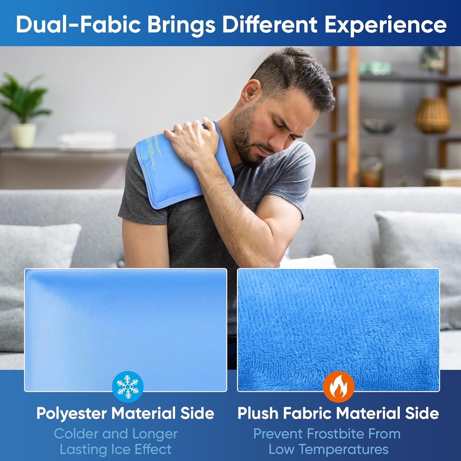 - Double-Sided Material: The gel ice packs reusable feature two-sided materials, one side is made of polyester for a stronger and longer-lasting cooling effect, while the other side is soft plush fabric, which prevents frostbite and enhances comfort during cold therapy