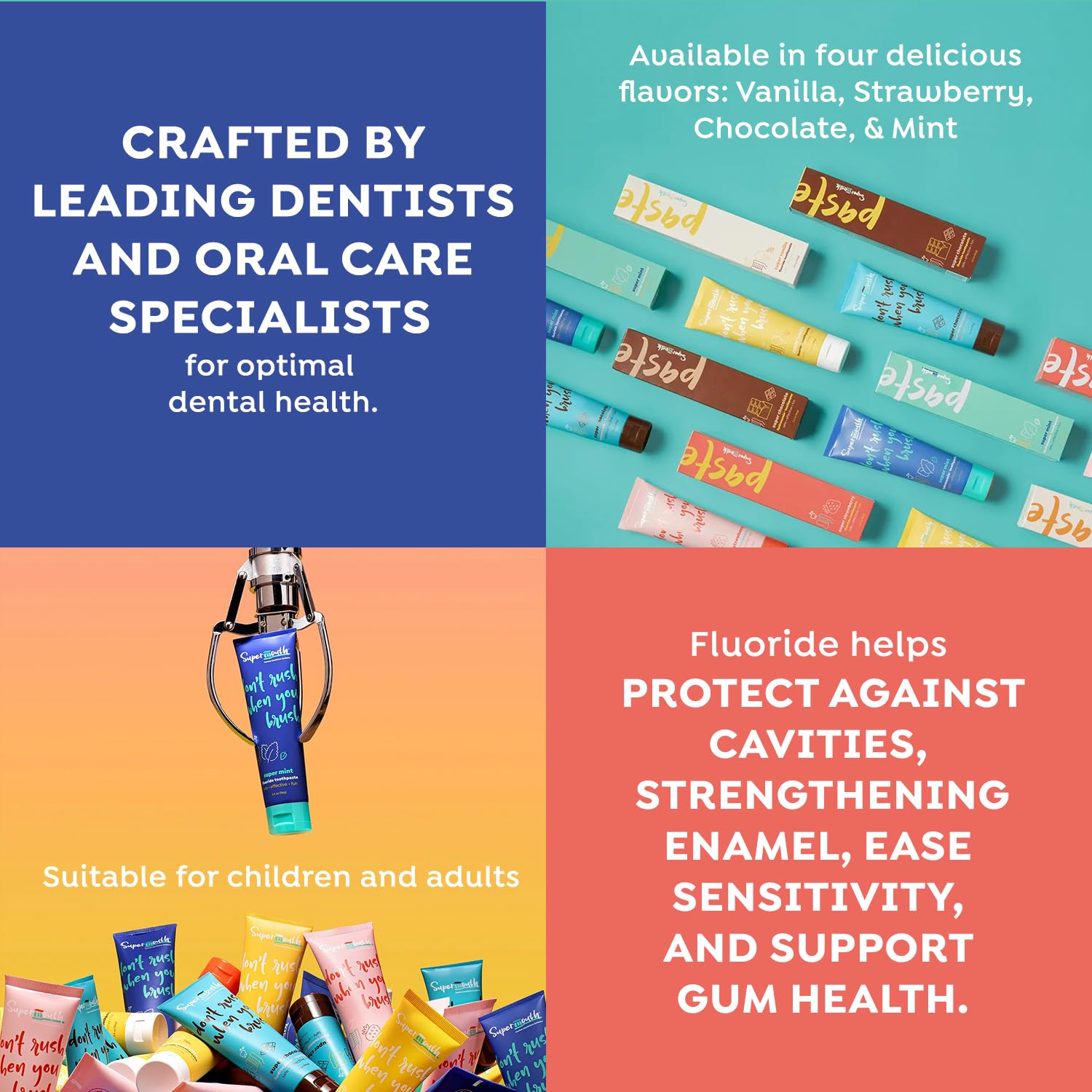 - Clean, Expertly Developed, & Sustainably Packaged: Rely on a toothpaste free from artificial flavors, colors, sweeteners, SLS, titanium dioxide, and other potentially harsh additives. Dentist-developed and made in the USA with globally sourced premium ingredients, SuperMouth is vegan, gluten-free, and packaged with sustainable materials—so you can protect your teeth, gums, and the planet every time you brush.