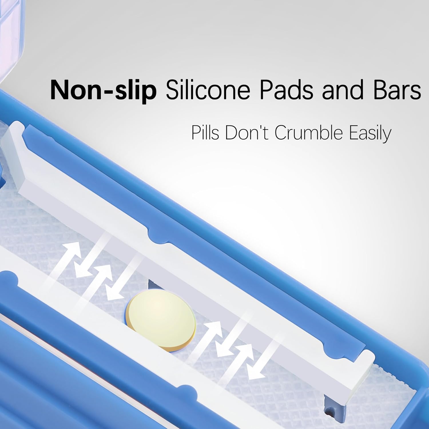 - 【Not Easy to Crumble】Pill splitter with centering device has 2 non-slip silicone bars and a silicone backing to cushion the squeeze and make the cut more evenly, won't crumble the pills lightly