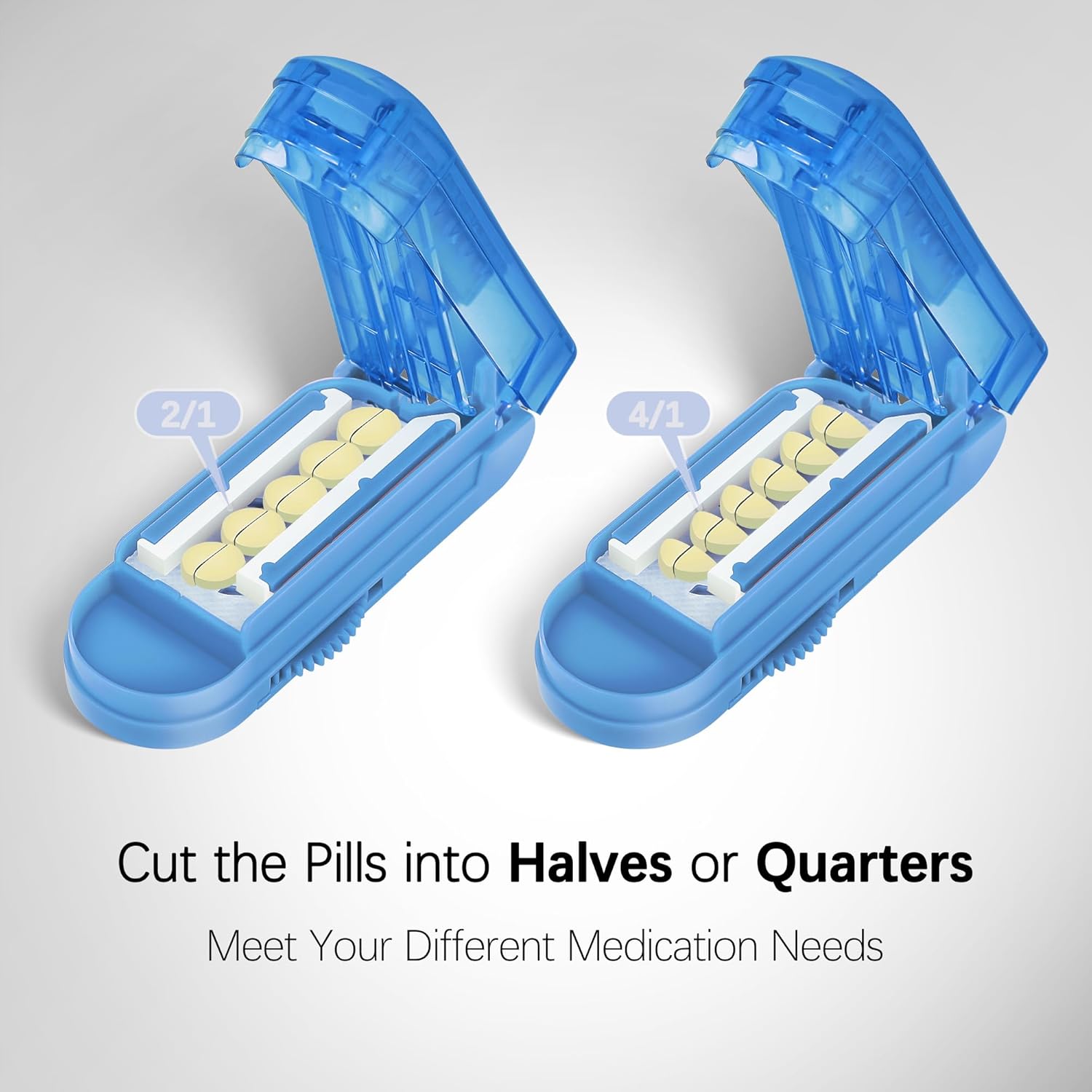 - 【Easy to Use】You just need to arrange the pills neatly on the pill cutter, make sure the pills are placed in the center, rotate the adjustable gear of the pill cutter to avoid the pills from sliding, and then press the lid to cut multiple pills into 1/2 or 1/4