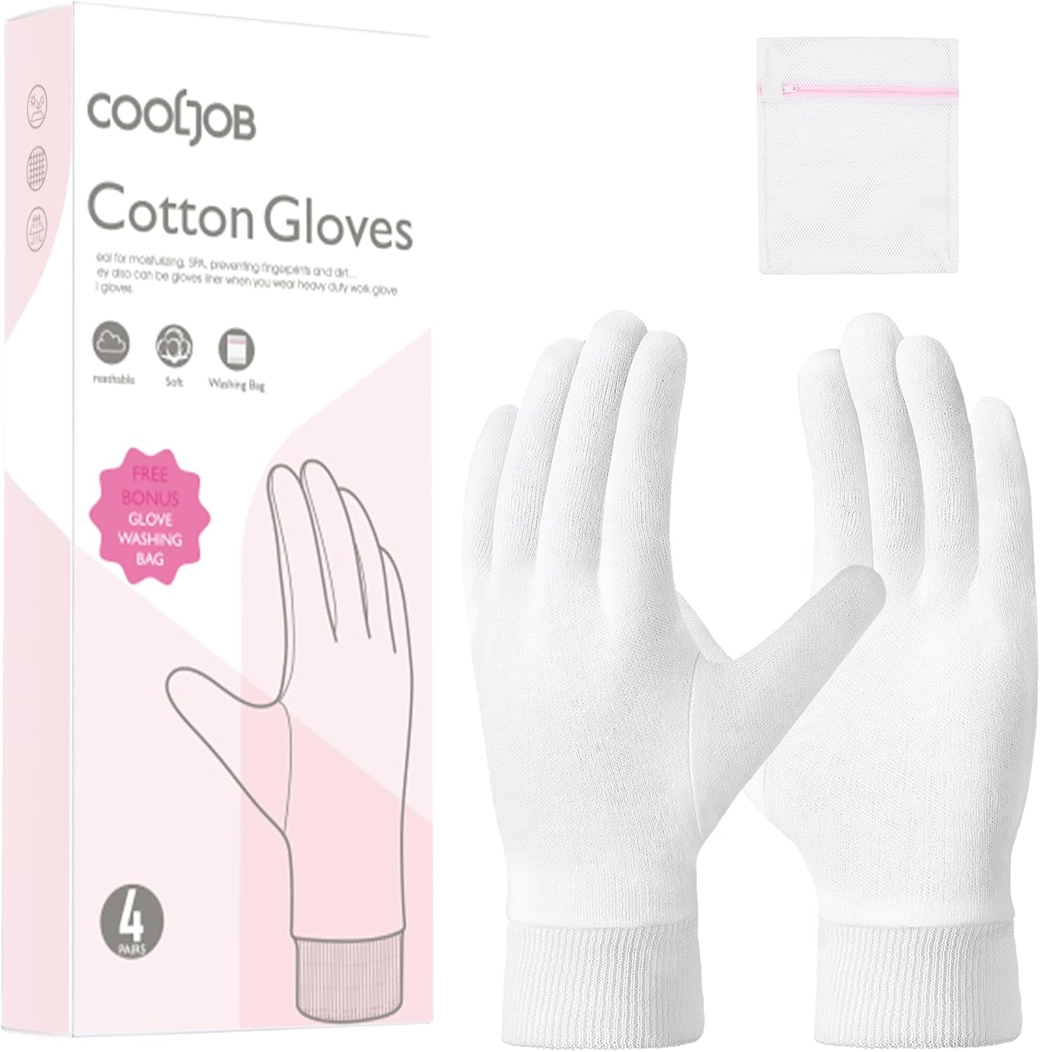 COOLJOB 4 Pairs Soft Moisturizing Cotton Gloves Set with Stretch Elastic Cuff, Overnight Lotion Sleeping Gloves for Dry Hands, Eczema Skin, Beauty Women SPA Essentials, Large, White