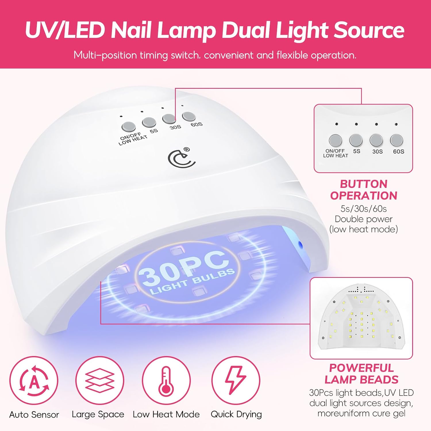 - ❤Professional U V Nail Light: This gel nail polish kit with u v Light contains great upgraded U V Light. The nail lamp is suitable for all gel, convenient and fast, easy to use. This nail lamp is automatic sensing, large space, and 30 pcs uniform distributed lamp beads, low heat mode, 3 Timer Setting - 5S / 30S / 60S, you can choose time according to your needs.