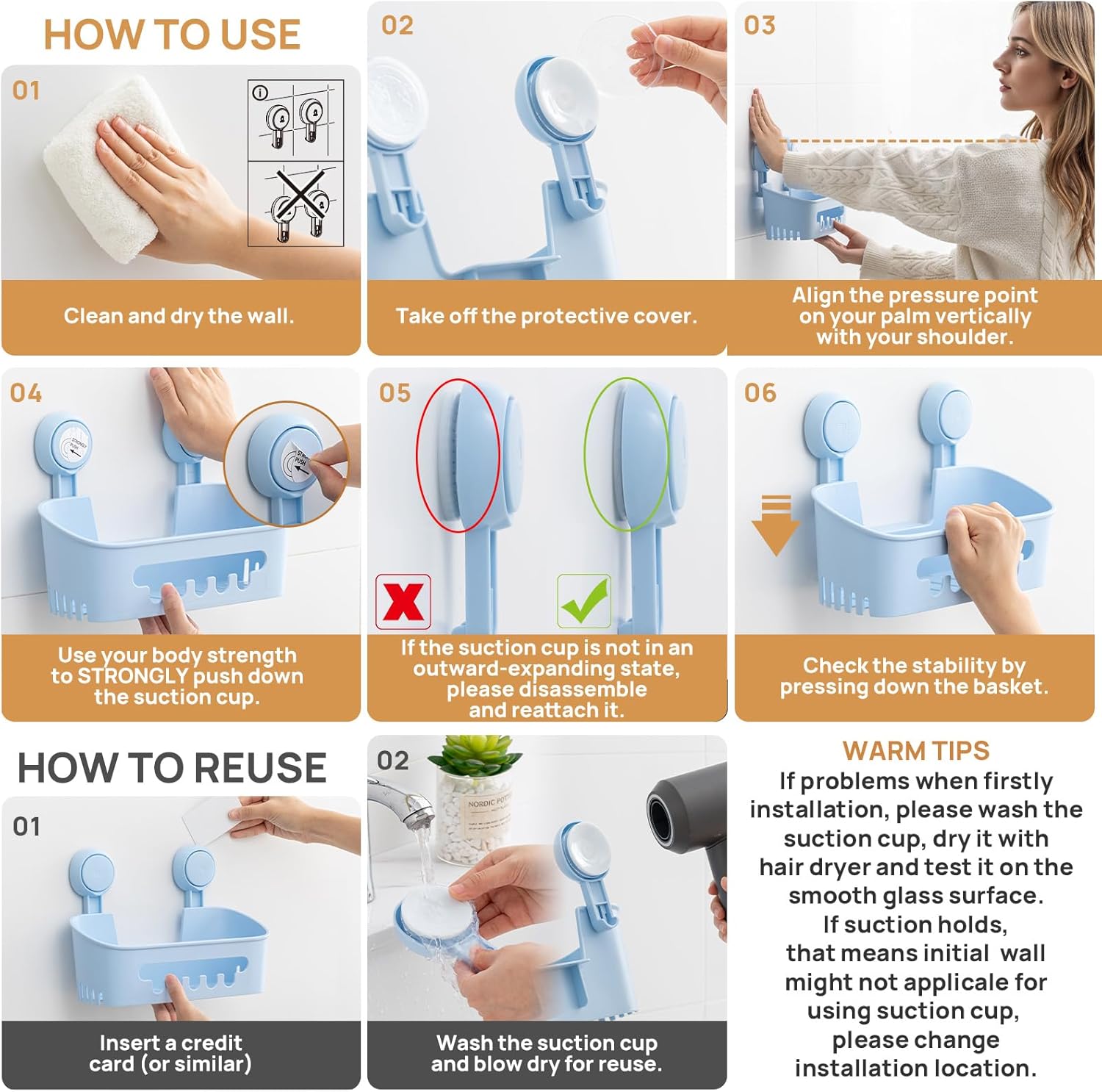 - One Second Installation: No drilling, no screws, no holes, no glue, no tools to apply the suction cup shower caddy. Simply choose a smooth and dry surface without any grout, take off the protective cover and push the board STRONGLY until you hear "PUFF", ONE second to complete the installation