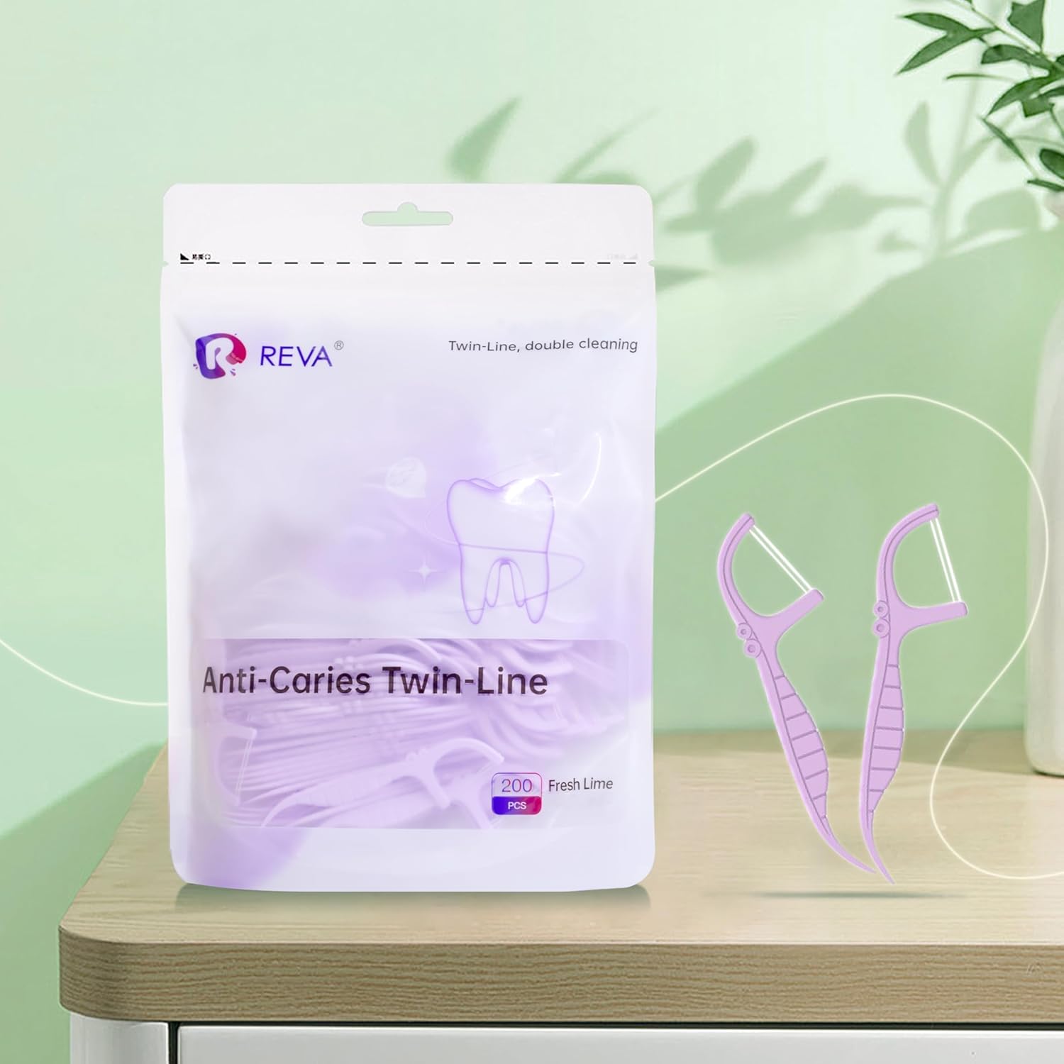 Reva Anti-Caries Twin-Line Dental Floss Picks - 200 Count (Pack of 1), Fresh Lime Flavour Toothpicks, Teeth Cleaning Sticks