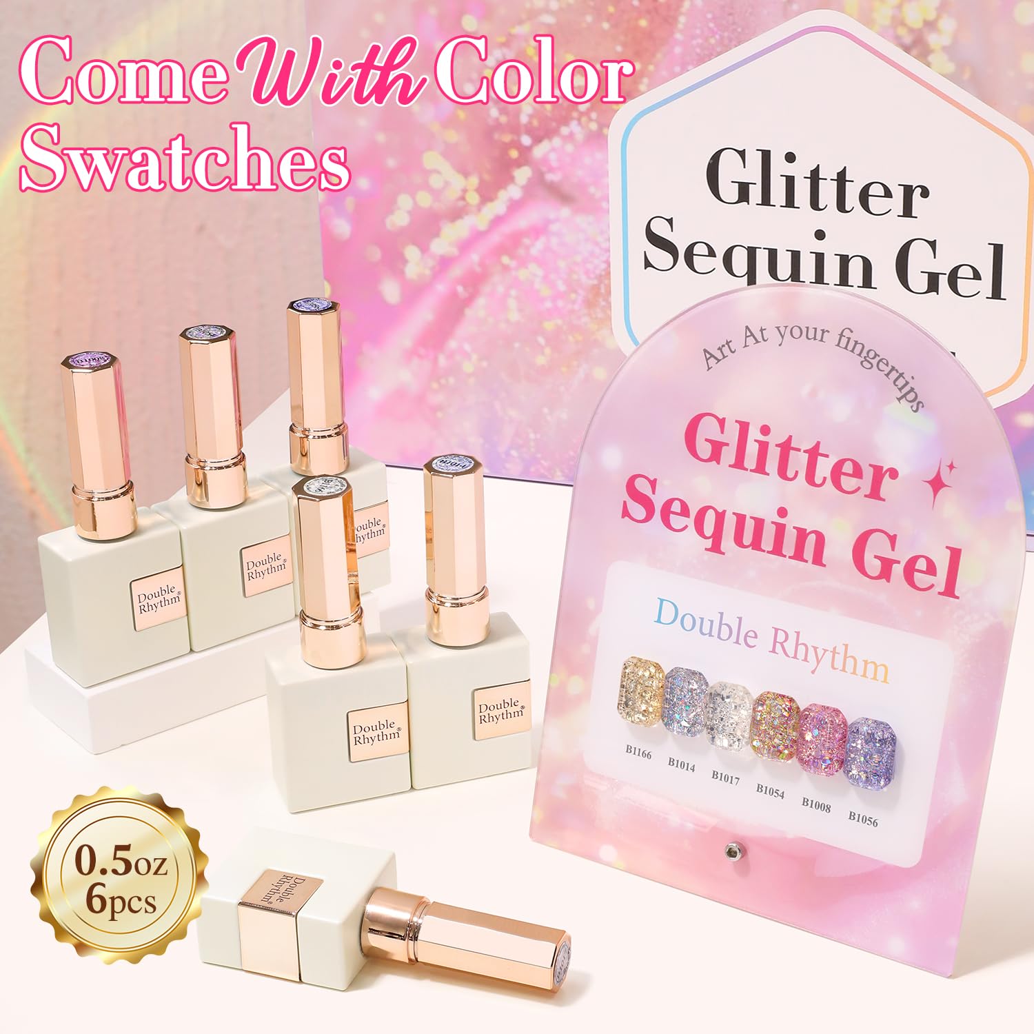 Double Rhythm 0.5 Oz Glitter Gel Polish Set of 6 Color with Display Board 15 ml Full Size Kit Shimmer Reflective Sparkle Soak Off Manicure Salon DIY at Home (Gold Blue Silver Purple Pink-T6-37)