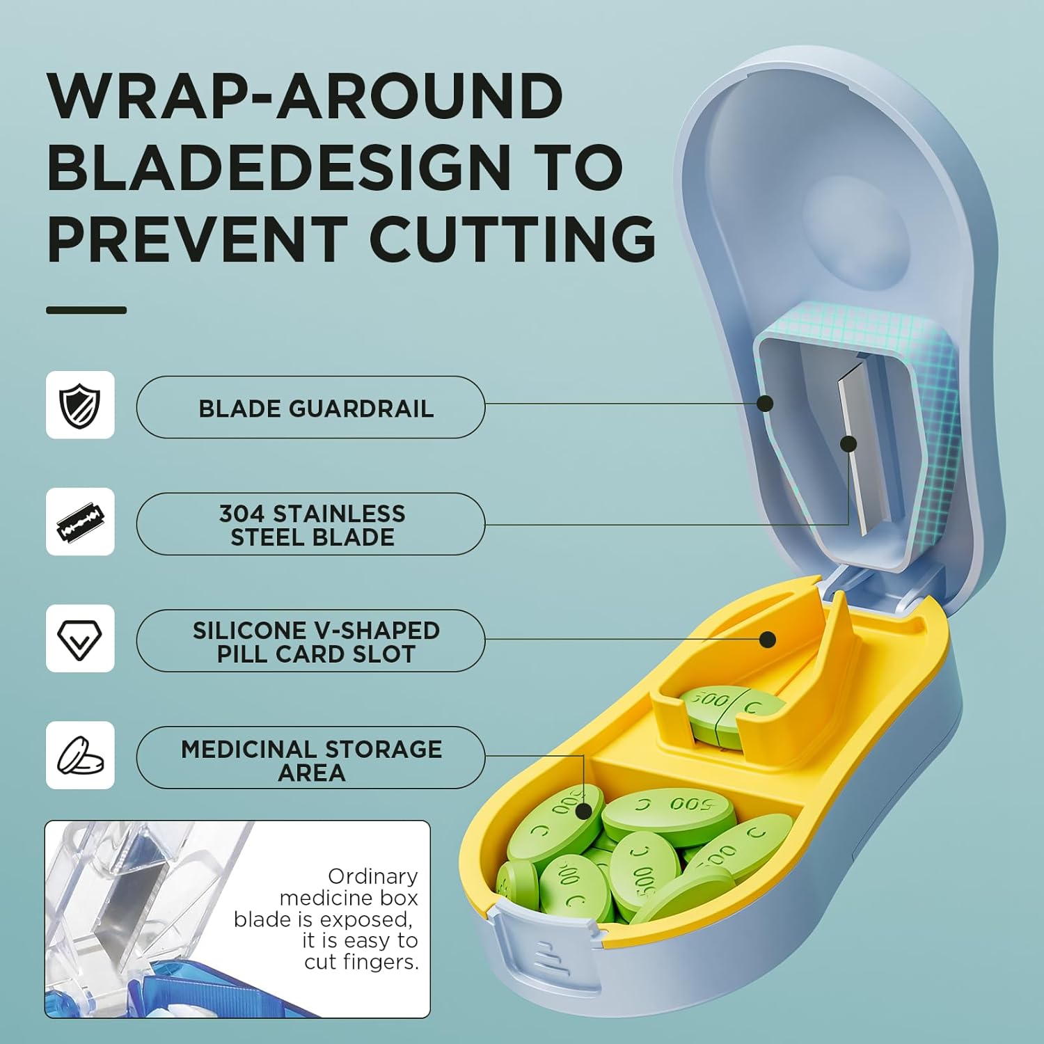 - 【Around Blade Guard Prevents Cuts】 Wrap-around blade design prevents the blade from accidentally cutting your fingers. Still, please keep children and old man away from the pill cutter.