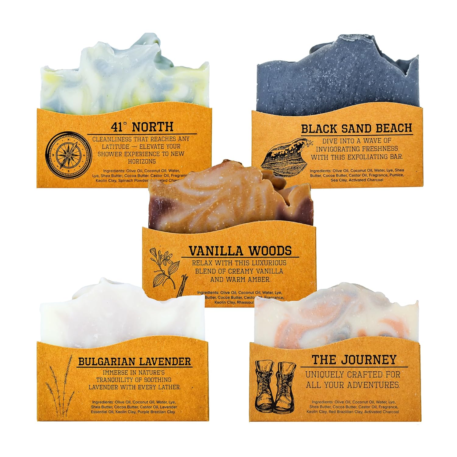 - SCENT VARIETY: Elevate your grooming with a mix of bold scents in our variety pack, featuring 41° North, Black Sand Beach, Vanilla Woods, Bulgarian Lavender & The Journey. This women and mens body soap bar set is a perfect addition to your daily routine.