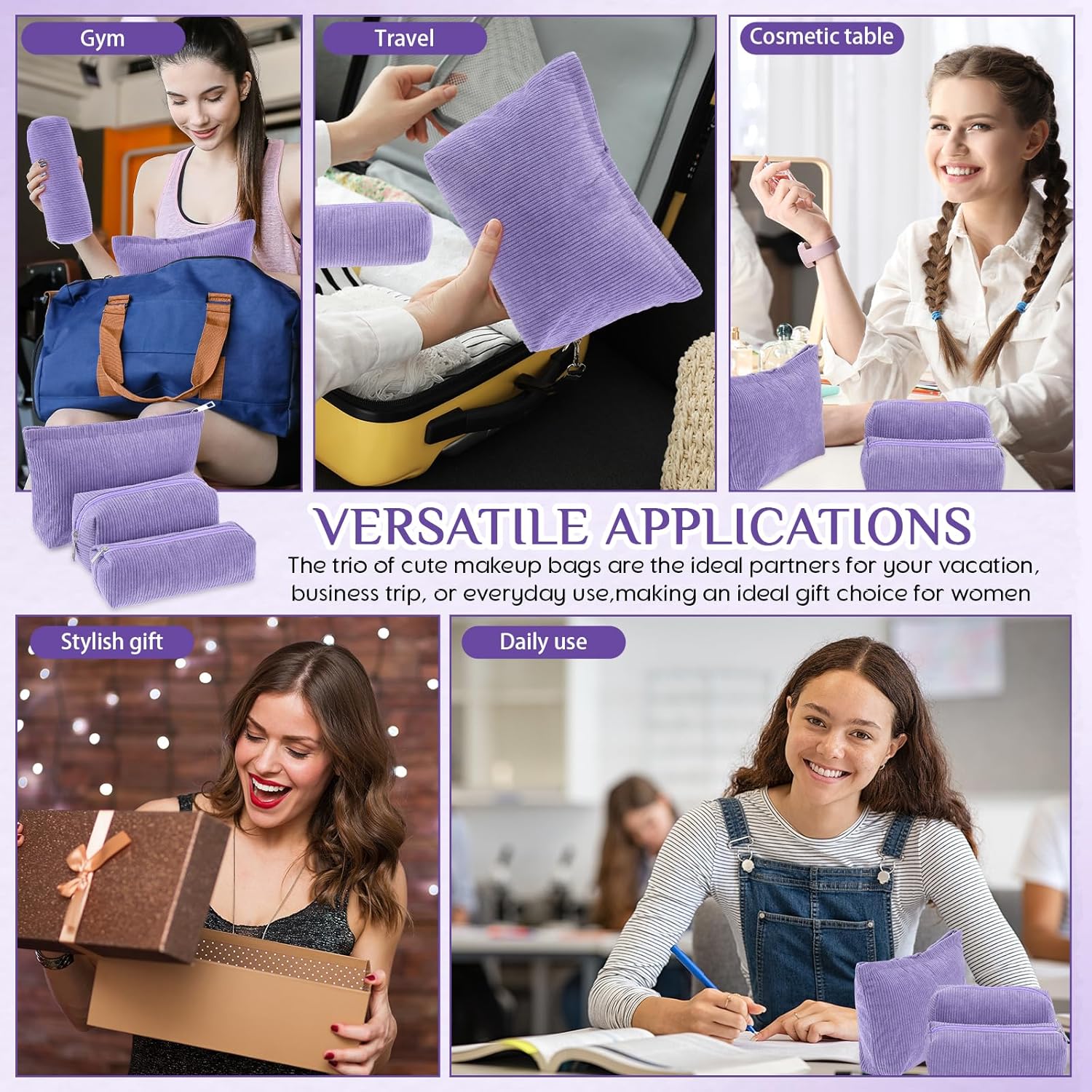 3 Pcs Makeup Bag Set for Women Corduroy Cosmetic Pouch Aesthetic Smile Travel Toiletry Bag Cute Purse Pouch Pencil Case Makeup Brushes Storage Organizer for Christmas(Purple,Solid Style)